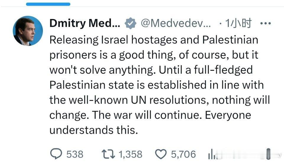释放以色列人质和巴勒斯坦囚犯当然是好事,但这解决不了任何问题。除非巴勒斯坦按照众所周知的联合国决议正式建国,否则一切都不会改变。战争仍将继续。这一点大家都明白。