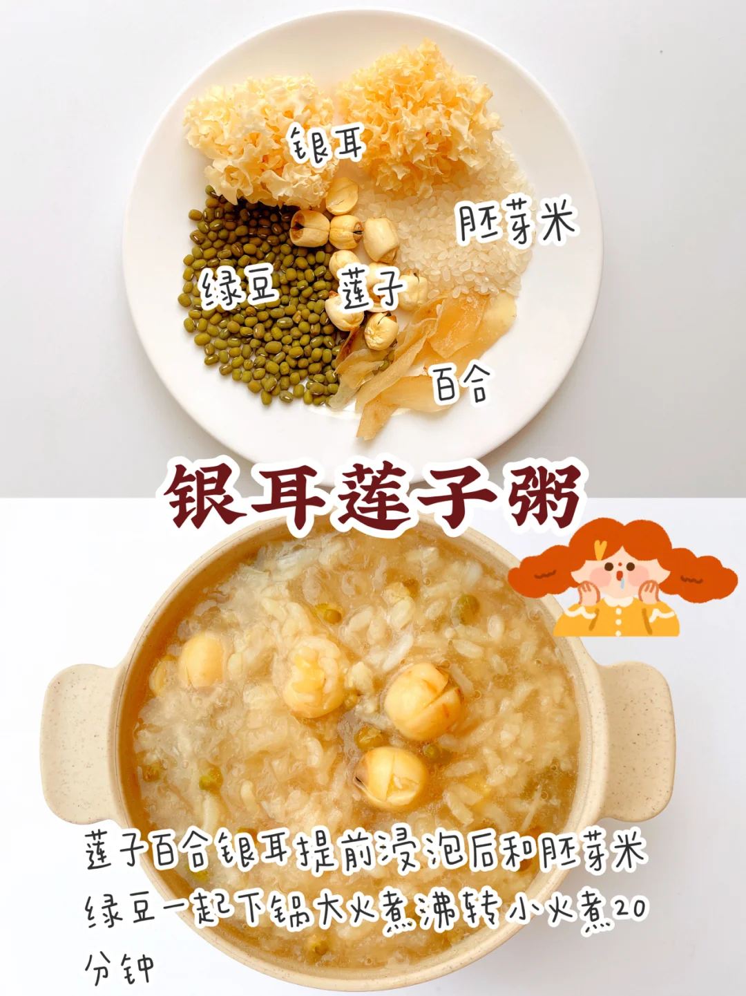 食材:银耳、绿豆、莲子、百合、胚芽米