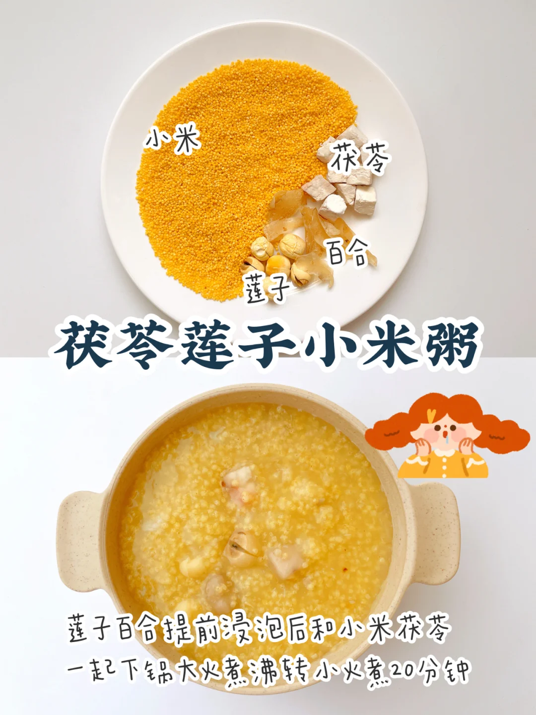 煮制:莲子、百合提前浸泡后和小米、茯苓一起下锅➕食材两倍量的清水,大火煮沸后转小火煮20分钟左右。