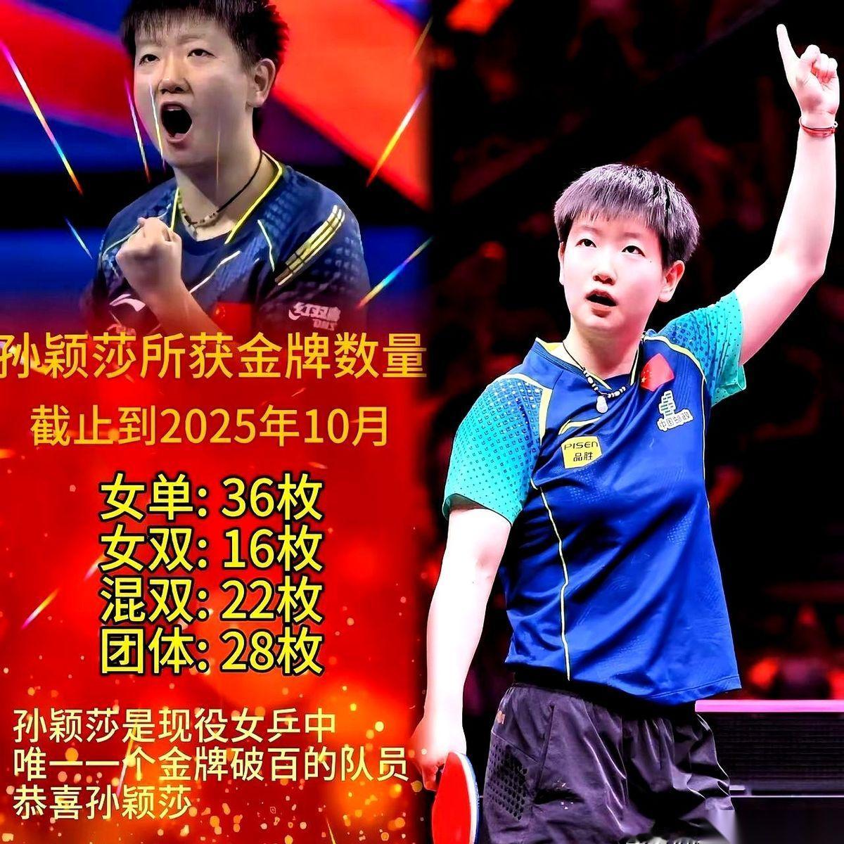 刚才看到个数据,直接给我干沉默了。 孙颖莎,金牌数量,破百。 一百枚啊,朋友们。不是十块糖,是一百块沉甸甸的金牌。 这什么概念? 就是别人还在为一块金牌拼得头破血流的时候,她已经批发了一百块,而且还是单打、双打、混双、团体……全覆盖无死角的那种。 这已经不是什么“偏科生”了,这是门门满分的学神下凡。 真的,有时候看她比赛,你会恍惚。 你会觉得,她跟对手之间,仿佛隔着一层结界。 她打的不是球,是寂寞。 别人追求的是赢。 她追求的,好像是“今天用什么姿势赢比较有新意”。 那句“和其他主力差距明显”,说得轻飘飘,但对其他顶尖选手来说,这六个字可能比输掉一场决赛还残忍。 因为这等于直接告诉你:你很强了,但不好意思,我们玩的不是一个游戏。 这些数字背后,藏着多少汗水和伤病,我们可能永远无法想象。 我们只是有幸,在一个叫孙颖莎的时代里,一次又一次地,见证一个活生生的传奇。 恐怖如斯,又让人心生敬畏。