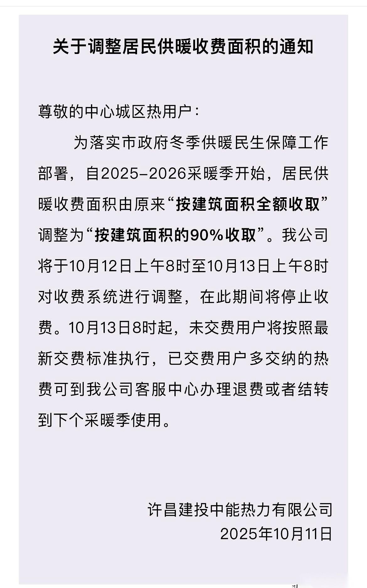 我天,许昌这暖气费的事儿,总算捅破那层窗户纸了! 按建筑面积的90%收取! 说白了,就是以前咱家那100平米的房子,连楼道、电梯井都得算上,一分不少地交钱。我就一直纳闷,我家暖气片,难不成还能穿墙给楼道供暖?凭啥呀? 这事儿叨叨了多少年,每年交钱都觉得憋屈。 这回好了,直接给抹掉10%。 虽然算下来可能也就省个一两百、两三百块钱,但心里那口气顺了啊! 这钱省得明明白白,舒舒服服。 看通知说,系统这两天就升级了。已经交了费的,多交的钱可以去退,也可以直接滚到明年用。还没交的,就等着按新标准来就行。 其实老百姓要的真不多,就是个“理儿”字。你把事儿办到咱心坎里,咱就念你的好。
