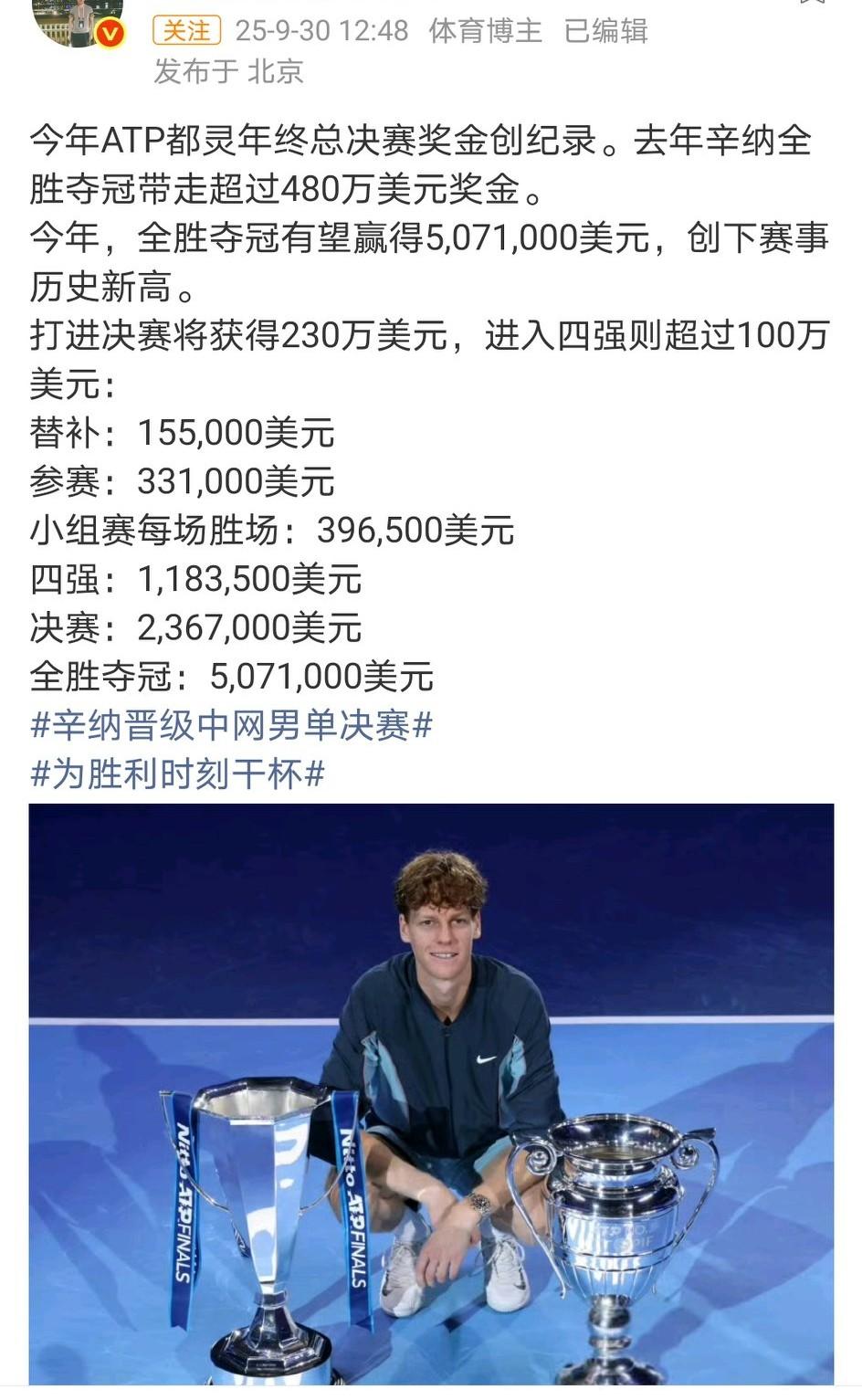 11月9日开启,ATP年终总决赛来了!德约打不打总决赛存疑,德雷珀养伤中,感觉阿利亚西姆会压哨入围。鲁德鲁内还赶得上吗? 11、鲁德2495 12、鲁内2490 妥妥滴分钱大会,参赛奖金33.1万美元,替补也有15.5万美元。全胜夺冠有507.1万美元。 如果辛纳阿卡在沙特六王表演赛、年终总决赛都是全胜夺冠,全部奖金累计高达1100万美元。