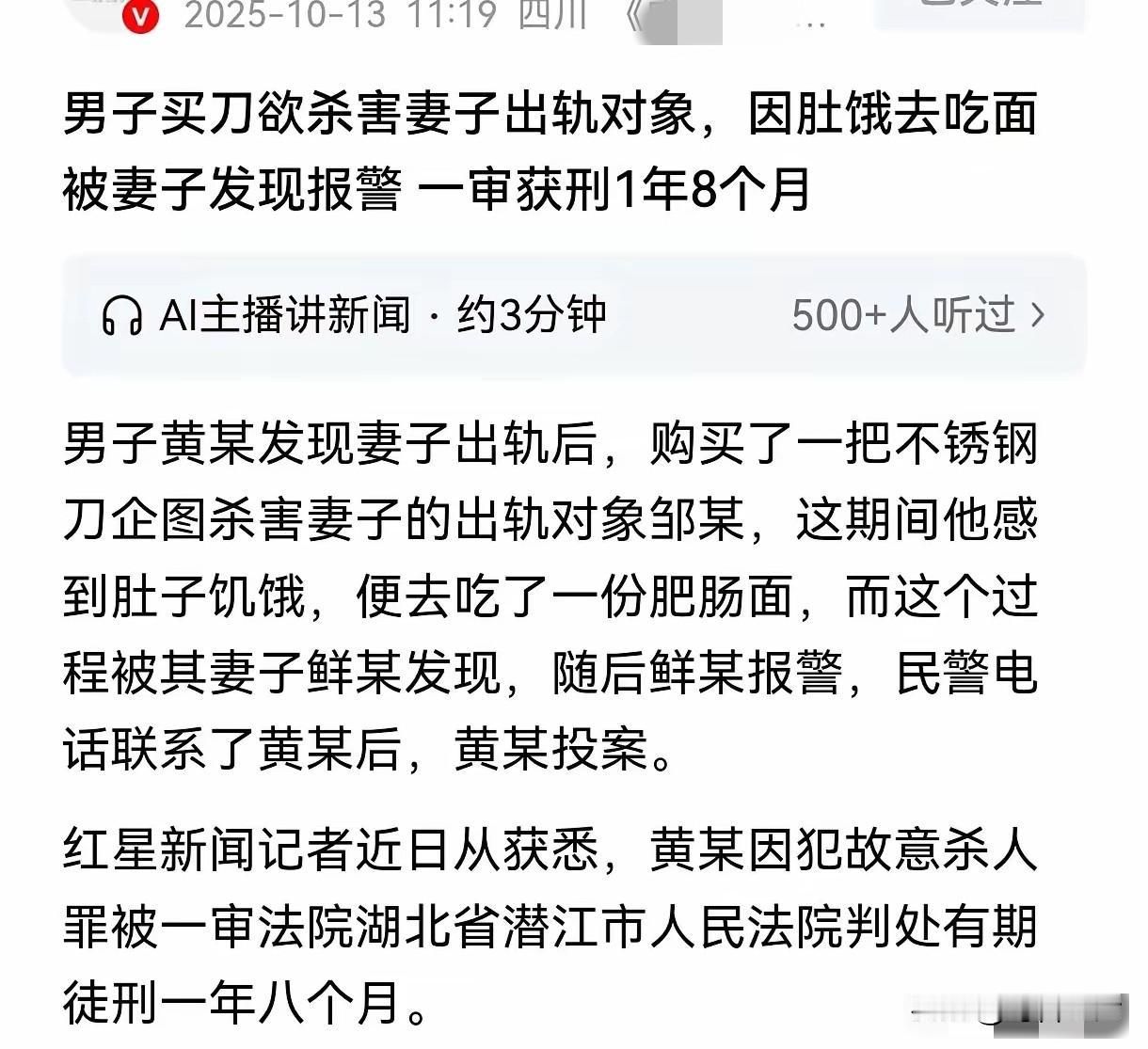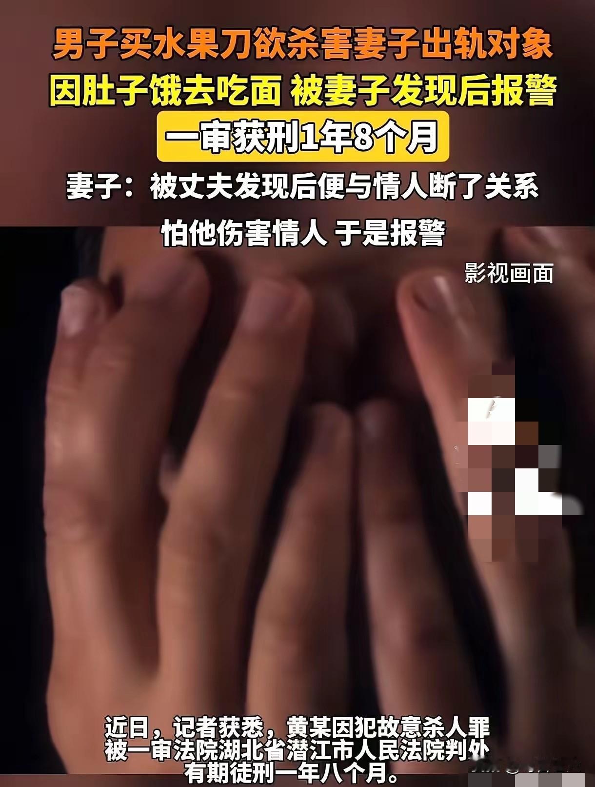 湖北潜江,男子发现妻子和一男人发展为了不正当关系,尾随妻子情人来到一广场,见对方上楼后,男子去隔壁超市花15元买了一把水果刀,准备等妻子情人下楼后再动手。后男子感觉肚子饿,想着去吃人生中的最后一顿饭,等他返回后,发现妻子情人已经离开,妻子打电话给他,说已经报警了,结果悲剧了。 黄某和妻子鲜某结婚多年,2024年11月,他发现妻子在外面有人了,无法接受这个事实,内心被仇恨填满,一个可怕的念头在他的脑海中滋生:他要找到妻子的情人邹某,让他付出代价。 这事搁谁身上不得憋一肚子火?可火归火,把“买刀蹲人”当成解决办法,简直是拿自己的命赌一口气。 15块钱的刀,买的不是公道,是把自己往违法的悬崖边推——他就没想过,真要是动了手,自己得蹲多少年局子?就算没动手,光是带刀尾随,也已经踩了法律的线。 中间那顿“最后一顿饭”最有讽刺意味:人饿了要吃饭是本能,可他那会儿满脑子都是“报复”,连这点理智都没剩。 就这么一会儿工夫,人走了、警察来了,他的“复仇计划”没成,倒先把自个儿送进了麻烦里。 其实婚姻里的背叛,最考验的是人的冷静劲儿。是坐下来掰扯清楚?还是及时止损各自安好? 哪样都比攥着刀瞎冲动强。他以为“让对方付出代价”能解恨,结果倒好,恨没消,自己先栽了——这不是解恨,是给自己添堵。 说到底,仇恨蒙了眼,冲动毁了事。多少人都是这样,被情绪带着跑,最后把好好的日子过成了烂摊子。 各位读者你们怎么看?欢迎在评论区讨论。