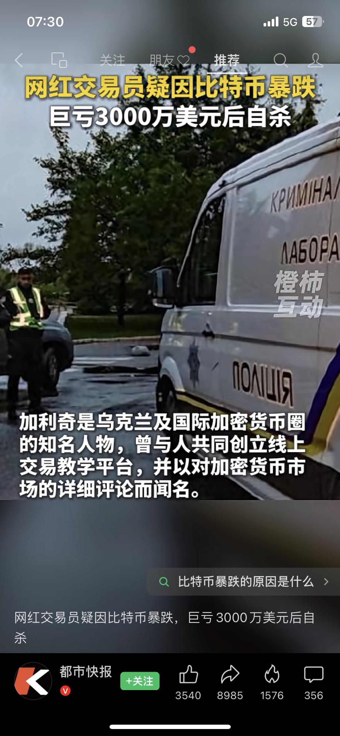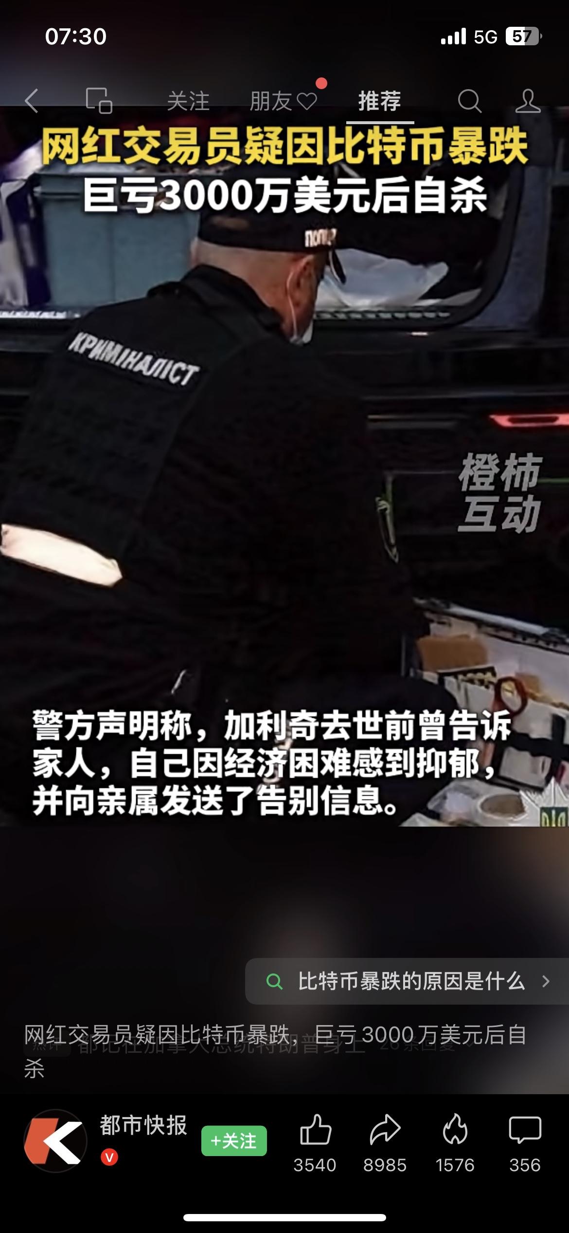 网红交易员因比特币暴跌巨亏3000万美元后自杀!加密货币的风险你真的懂吗? 家人们,这事儿太让人唏嘘了!乌克兰一个32岁的网红交易员,就因为比特币暴跌亏了3000万美元,直接自杀了!好好的一个人,就这么没了,加密货币这玩意儿的风险也太大了吧! 咱就说,加密货币这东西波动这么大,一会儿上天一会儿入地的,普通人真的玩得转吗?这个交易员还是个网红,按理说经验应该挺丰富的,结果照样栽了大跟头。这说明什么?说明加密货币市场根本就是个"绞肉机",不管你多厉害,都可能一夜回到解放前。 我觉得啊,投资这事儿,安全永远是第一位的。加密货币这种高风险的东西,咱们普通人还是离远点好。别看着别人赚钱就眼红,真要栽进去,可能连后悔的机会都没有。你们觉得加密货币还能碰吗?评论区聊聊,也让我看看大家对这玩意儿的看法!