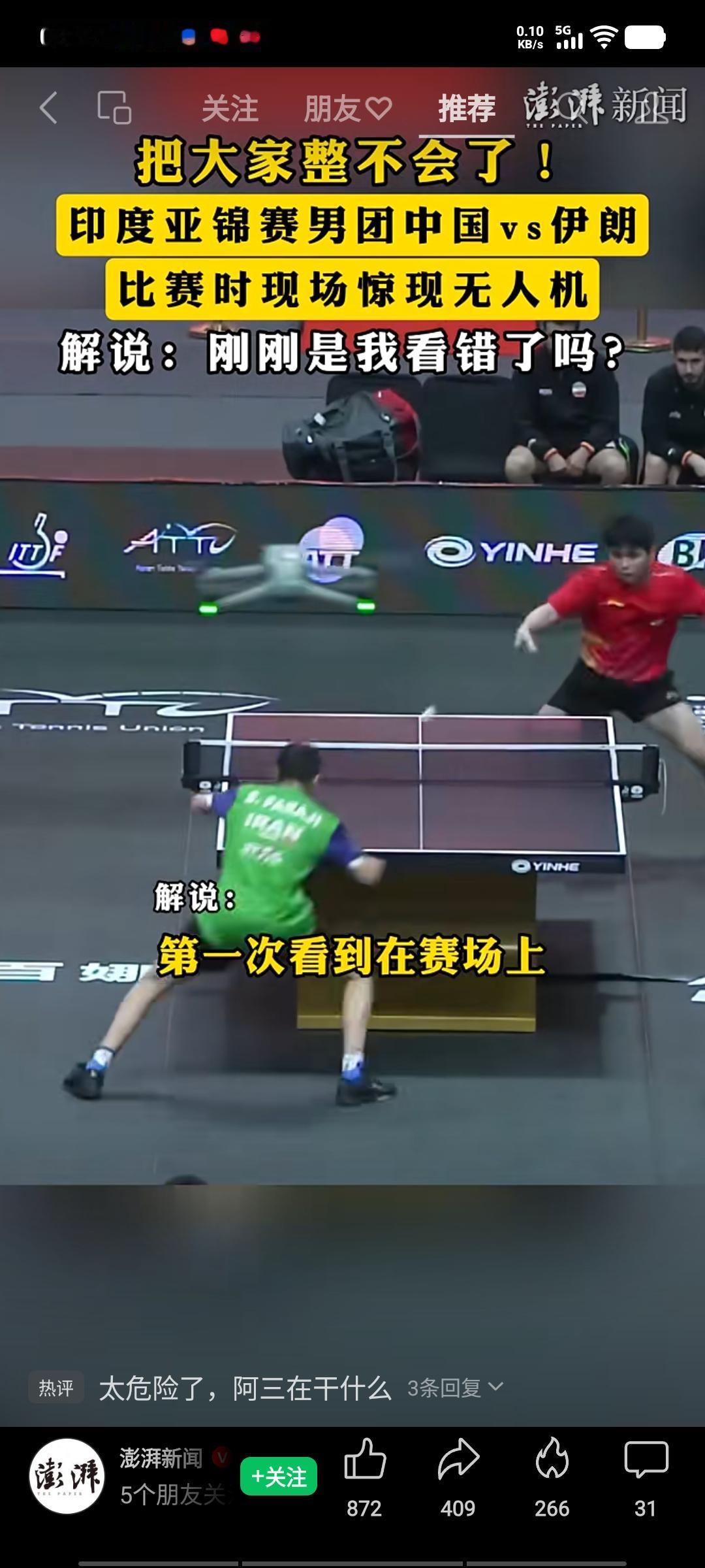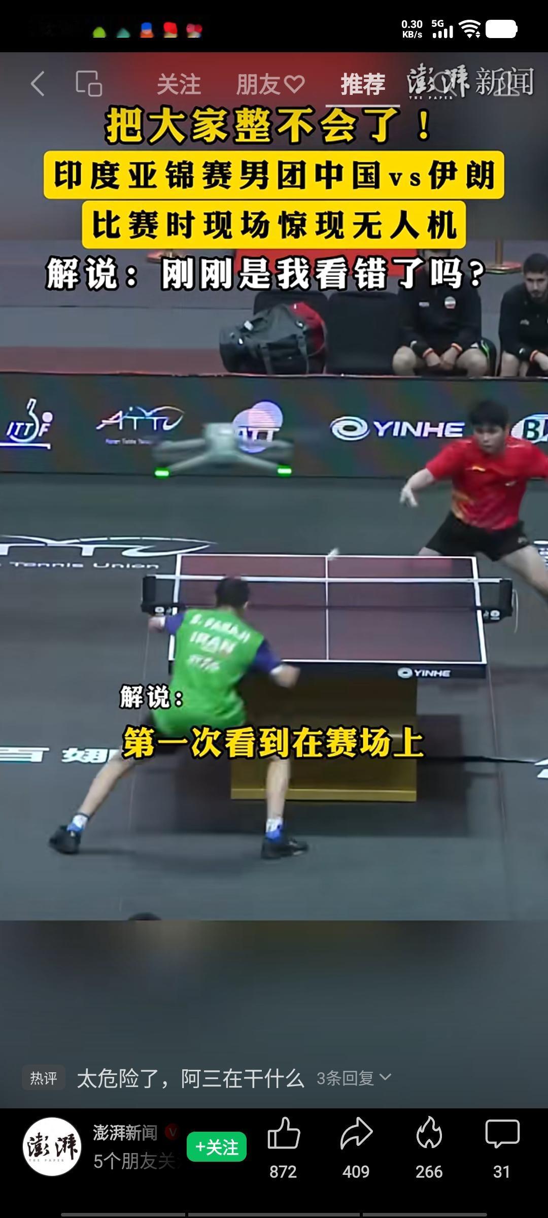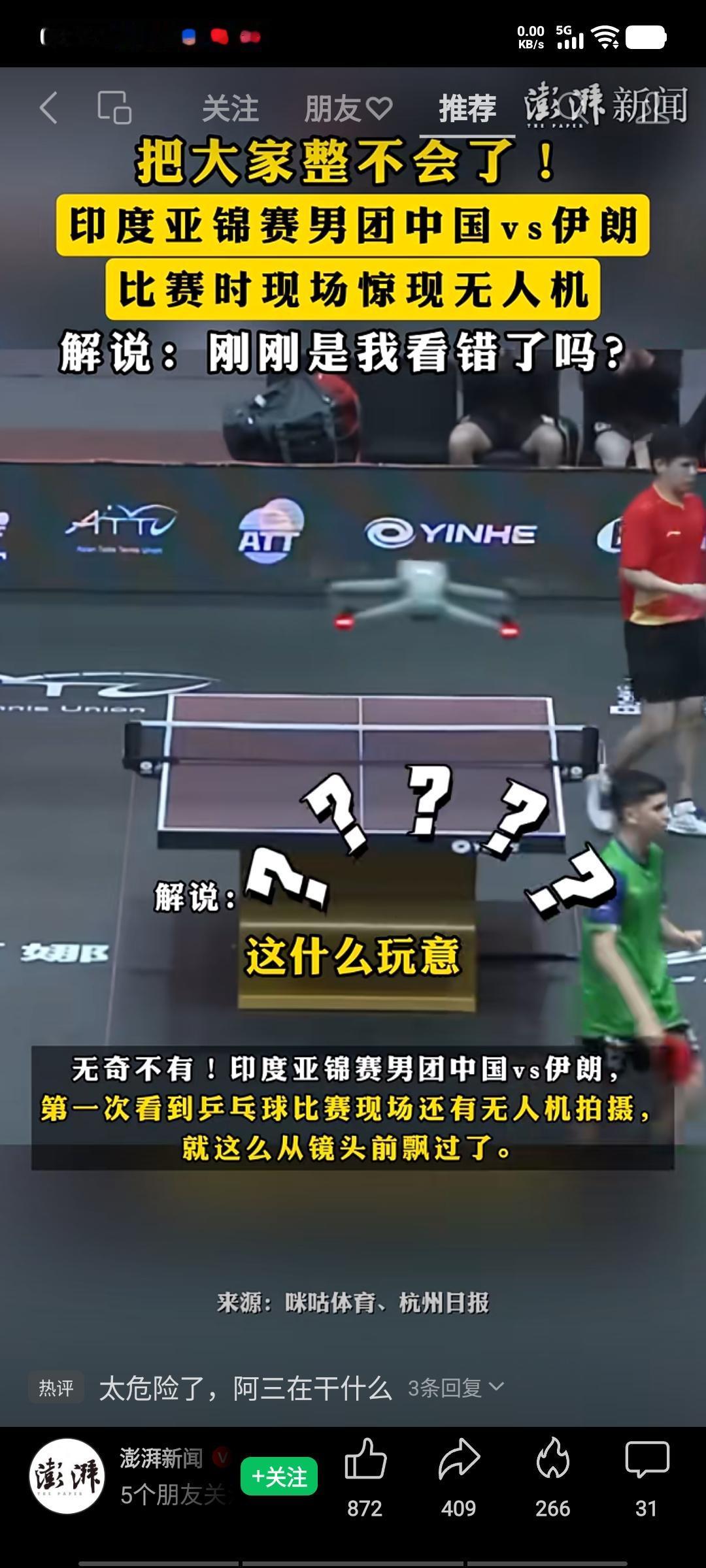 印度亚锦赛怪事频出,比赛中竟有无人机在球桌上方掠过。昨晚中国队与伊朗队的四分之一决赛里,林诗栋和对手正打得难解难分,一架小型无人机突然从侧面飞来,把两名运动员都弄懵了。球场条件简陋也就罢了,卫生状况堪忧也能忍,乱挂旗帜的问题解决了,运动员自己捡球也能克服,可这无人机超低空突然闯入,实在说不过去。万一伤到运动员,找谁负责呢?正如王皓教练所言,办不了就别办,这样的小赛事都办不好,还想申办奥运会,简直是异想天开。