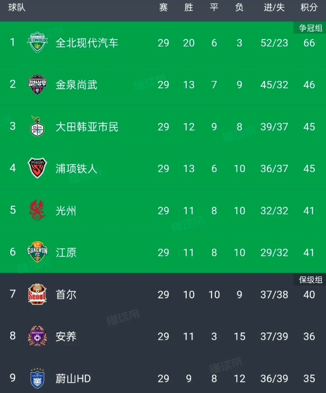 申花和蓉城两支中超争冠球队,在亚冠输给了韩国两支保级球队。 亚冠首轮,中超领头羊成都蓉城1比2负于韩国K联赛倒数第4名球队蔚山,中超第3名上海申花1比2负于韩国K联赛第6名江原。 韩国K联赛的倒数第3名球队就要打升降级附加赛,蔚山排在K联赛倒数第4名,只比倒数第3名水原多4分,是K联赛标准的保级球队。 江原虽然排名K联赛第6,但只比保级组多1分,也算半个保级队。 申花和成都负于韩国保级球队,意味着中超争冠球队如果参加韩国K联赛,只能在保级区挣扎。