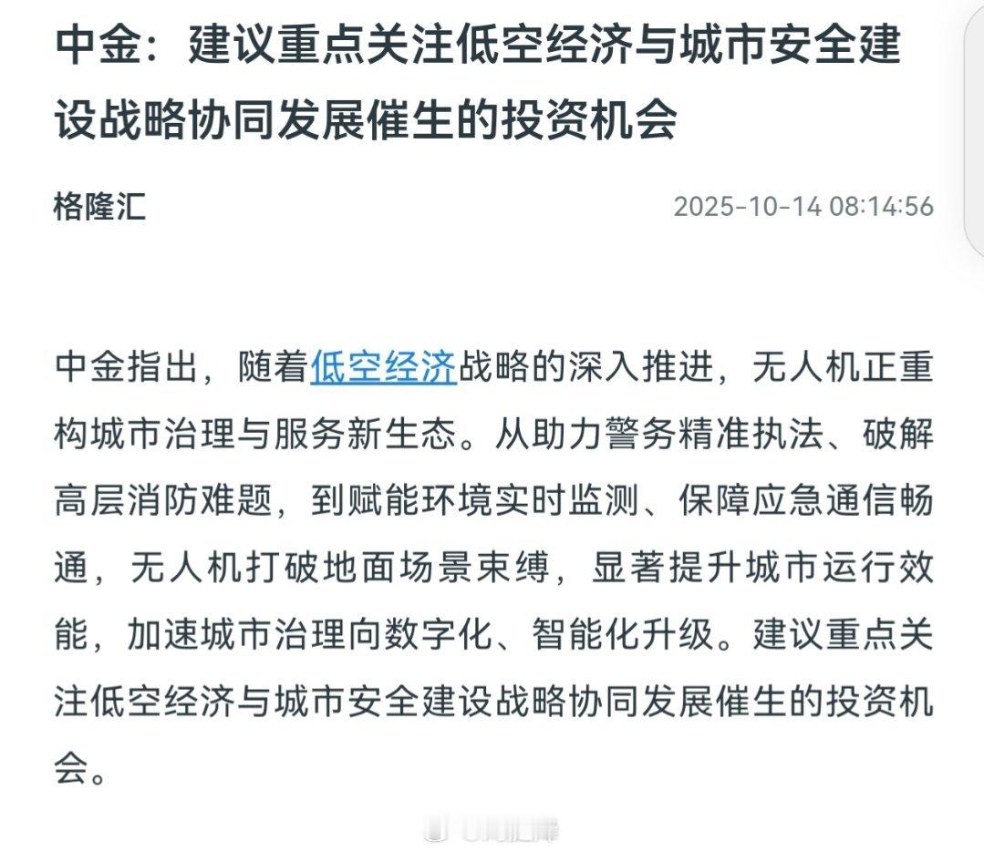 中金:建议重点关注低空经济与城市安全建设战略协同发展催生的投资机会a股