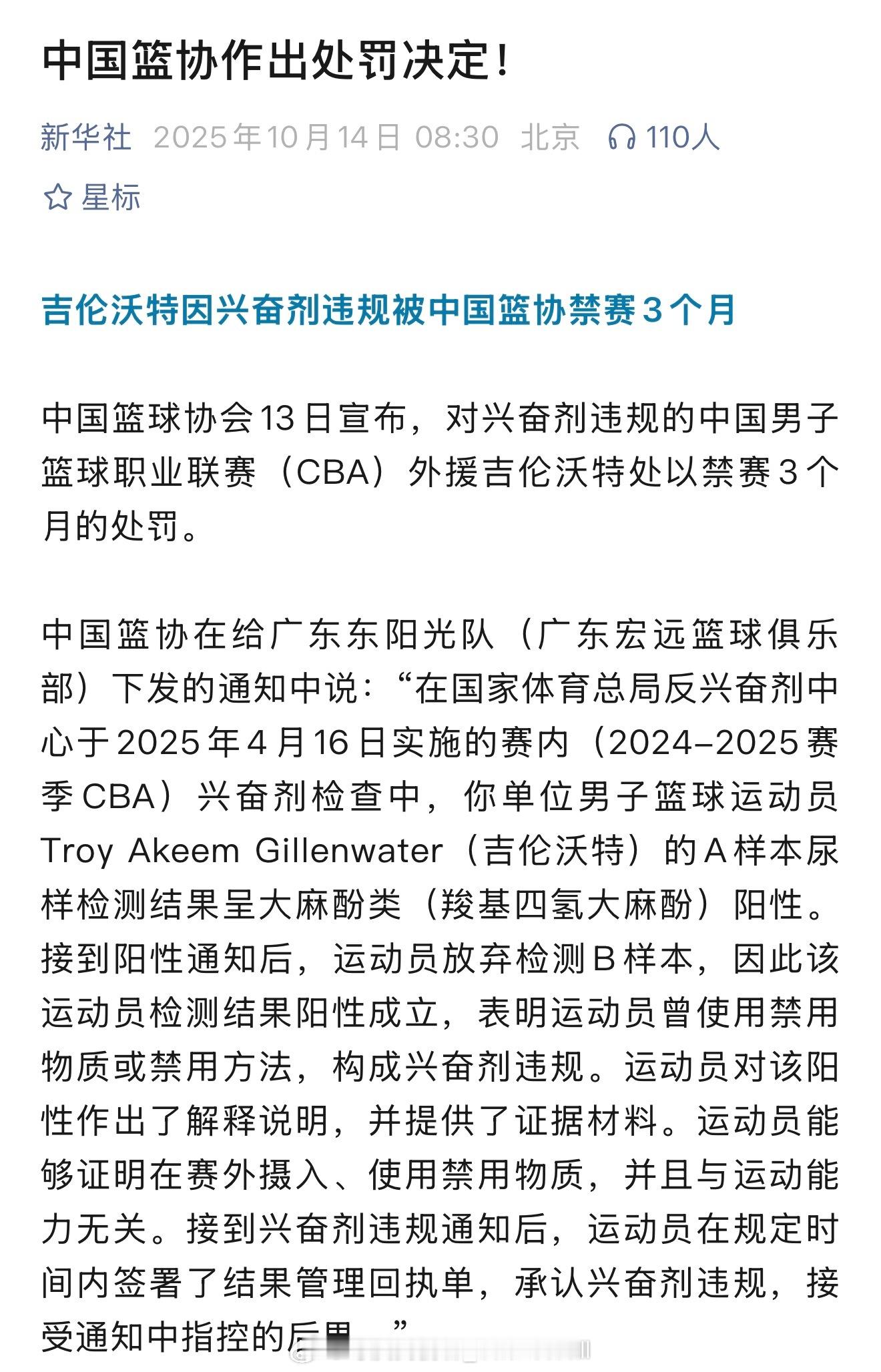 官方媒体也转发了中国篮协的处罚通报并且透露:上赛季新疆男篮外援哈雷尔的大麻酚阳性结果还在核实过程中,对其的处罚决定将另行公布
