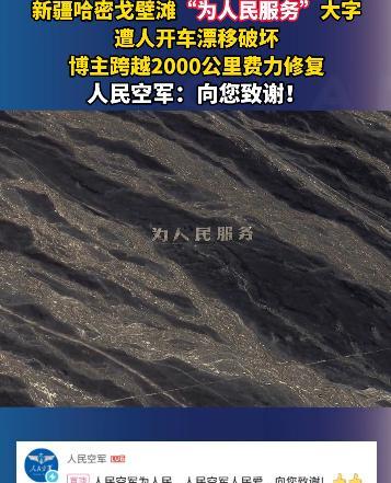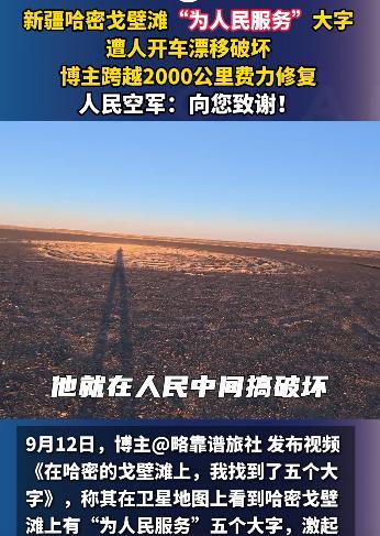 网红博主为了拍一张照片,居然调用了一颗卫星?空军看到后指示该发表,向你致敬! 9月的卫星图像里,新疆哈密戈壁滩上的五个巨型大字格外扎眼。 “为人民服务”每个字都有篮球场那么大,在苍茫天地间泛着黑石的哑光。 可谁也没料到,“人”与“民”之间那片本该平整的黑石地面,竟布满了像伤疤一样的车辙圆圈,最深的沟壑能把手指没到掌根。 这处扛过40年风沙的地标,没败给自然,却遭了人为的糟蹋。 让这道“伤疤”被看见的,是南方博主“略靠谱旅社”。 9月12日,他在卫星地图上偶然发现这个奇特地标,一时好奇便驱车出发。 2221公里的路程走了整整六天,高速爆胎、车陷沙土,最后15公里更是靠着指南针一点点摸索,才终于站到了大字跟前。 可眼前的景象让他瞬间红了眼:地表的砾幕层像碎玻璃一样散落,那是戈壁最珍贵的生态保护层,一旦破坏几十年都恢复不了。 这可不是普通的石头字,上世纪60年代,解放军第八航校的官兵扎根在这片没GPS的戈壁,飞行员训练时常常迷航。 将士们顶着40℃高温,用皮尺一寸寸量、铁锹一锹锹挖,花了五个多月才用黑戈壁石铺出这片7.5万平方米的地标。 更特别的是,这片戈壁曾是核试验地、航天测控点,这五个字早成了刻在大地上的国家记忆。 破坏痕迹的主人很快被网友扒了出来。 小红书账号“新疆平头哥旅游越野带队”里,藏着他此前发布的视频。 白色越野车在“人民”二字间疯狂漂移,车轮卷起的石子砸在黑石上噼啪作响,配文里还带着炫耀的语气。 可面对全网指责,他删了视频,换了个疑似小号发视频喊冤,我就是路过拍个照,遭网暴太冤了,甚至狡辩“这地方早被人破坏过”。 目前,他的账号已被平台禁言,没等破坏者认错,博主已经撸起了袖子。 为了找颜色匹配的黑石子,他跑遍哈密的矿业公司和老砂厂,两天下来手指磨得发红,才终于凑齐20吨石料。 怕重型车二次破坏,他把石料卸在3公里外的铁路边,用小货车一趟趟转运,整整跑了27趟。 戈壁的日子不好熬,白天太阳晒得石头烫手,几个人蹲在地上徒手填沟壑,手上全是水泡。 夜里气温降到零下,就挤在帐篷里啃干粮。就这样干了七天,所有车辙终于被填平。 可修复完想拍张全貌却犯了难——新疆全域禁飞无人机。 最后没办法,他辗转联系上长光卫星,才等到“吉林一号”过境的23秒窗口期。 9月28日12时45分51秒,卫星在高空按下快门,传回的图像里,五个大字终于恢复了完整的模样。 10月11日,人民空军官方账号在他的视频下留了言,人民空军为人民,人民空军人民爱,向您致谢! 钧正平也发文痛斥,这标语是艰苦年代信仰的实体化象征,破坏它就是亵渎先辈热血。 截至目前,博主的修复视频播放量超2000万,点赞量突破90万,网友们在评论里说得最多的是,这才是真网红该有的样子。 可这事儿远没结束,博主自掏腰包修完地标,没要一分钱报销;破坏者虽被禁言,却没掏过一分赔偿款。 更让人揪心的是,这处承载着厚重历史的地标,至今没“上户口”,它不是文物,法律上没法对破坏者从重处罚。 但好在网友没放弃,10月10日,#请给戈壁标语上户口#冲上热搜,大家纷纷呼吁给这些“沉默的地标”一个名分。 地方文旅部门也回应说,正在研究是否将其纳入保护范畴。 当卫星再次掠过哈密戈壁,那五个大字在阳光下格外清晰。 一边是跨越千里搬石头的守护,一边是为流量肆意破坏的嚣张;一边是自费修复的公益心,一边是钻法律空子的狡辩。 这对比里藏着最直白的答案:真正的流量从不是靠糟蹋历史换来的,而是像那些黑石一样,要经得住时间的考验。 “为人民服务”这五个字,从来不是网红的背景板,而是先辈用青春写就的初心。 信息来源:央视军事2025-10-13发布视频