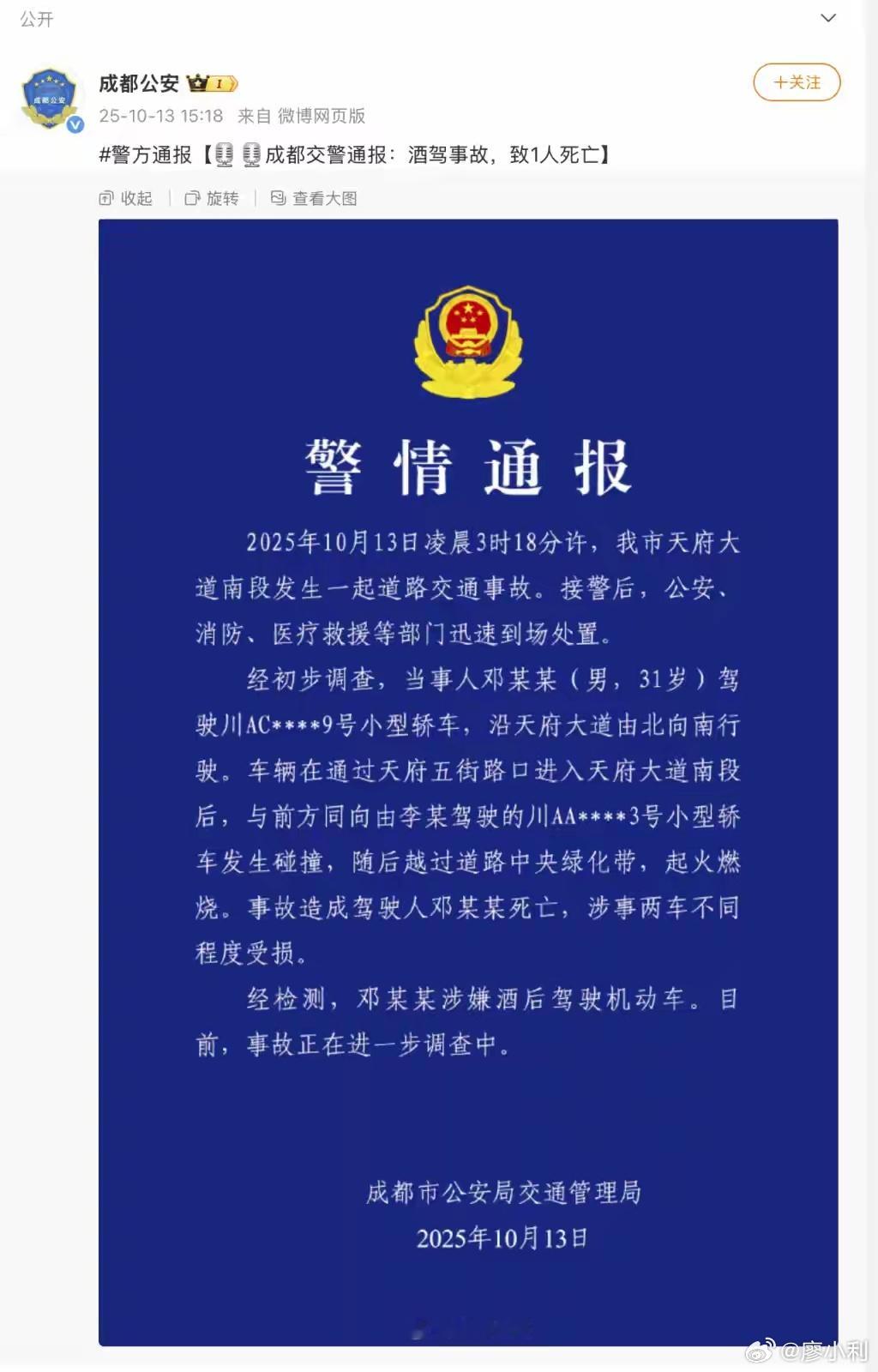 13号凌晨天府大道发生惨烈车祸,一辆小米SU7像失控的子弹般撞上绿化带,翻滚着