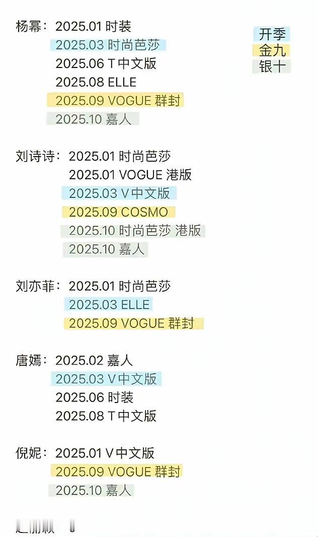 杨幂和刘诗诗都拍了6本,唐嫣四本,刘亦菲三本,倪妮2本,赵丽颖一本都没有