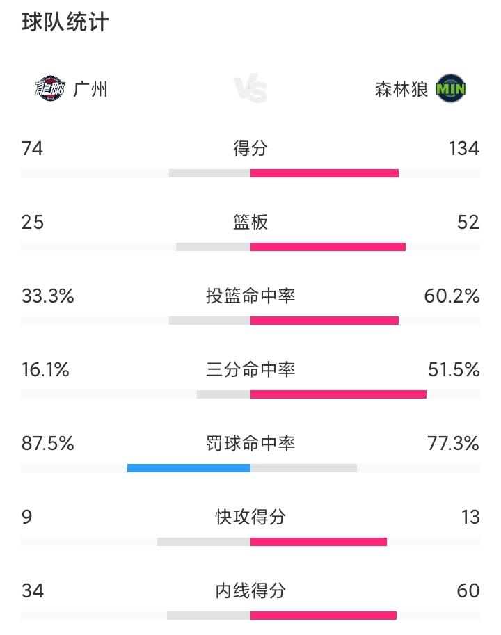 三场输了138分,场均净负46分! 风风火火,广州队又是一场惨败。此前31分负于马刺,47分败于快船,刚刚又74-134输给森林狼。场场大败,输麻了,这不是来找差距的,弥补不足的,这是来到“虐”的,打击信心的。显然以广州队的实力,打NBA季前赛太难为他们了,打夏季联赛还差不多。 季前赛,一般情况下,主力或者重要轮换球员只是象征性的打上半场,下半场直接坐在板凳席。本场比赛森林狼是全替补,够给面子了,然而面对替补的替补,广州队还是“无力反抗”。比如本场比赛,上半场输了32分,下半场又输了28分。 造成这样的原因,替补阵容大多数是短期合同或者双向合同,他们为了获得一份合约,为了立足于NBA,可不会手下留情,那是铆足力劲儿,展现自己,以获得青睐。就是这样,国内球员还是与其存在很大的差距,后者竞争力太大了。