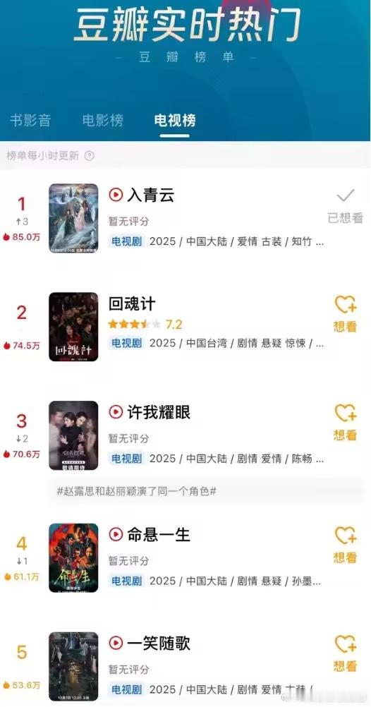 入青云双榜登顶 没想到《入青云》能这么受欢迎,2025年第40周直接登顶猫眼两大榜单,这热度确实能说明问题。侯明昊把表面纨绔、内心深沉的纪伯宰演活了,卢昱晓的明意既有战神的锋芒,又有伪装时的柔媚,两人戏里戏外都很有默契,加上不注水的剧情,追起来特别过瘾。
