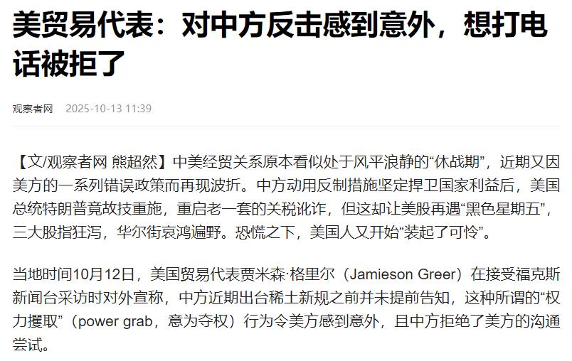 中国拒绝了美国的通话请求! 事情的来龙去脉得从美国贸易代表贾米森·格里尔的一连串动作说起。在我们刚宣布扩大稀土出口管制措施,格里尔这边就急了。从公开渠道得知消息后,第一时间就紧急联系中方,希望能进行电话沟通,可中方直接拒绝了他的请求。 碰了钉子的格里尔转头就急匆匆跑到媒体面前表态,当地时间10月12日接受福克斯新闻台采访时,他抱怨说美方事前根本没收到通知,还称中方这种做法让他们感到意外。这番急于向外界“诉苦”的姿态,反倒把美方的被动和焦虑暴露得明明白白。 而这背后,恰恰是中方反制战术的关键所在——就是要让反复横跳、不断破坏中美共识的美国彻底明白,中国的底线不容试探,一旦触碰,后果必须由美国自己承担。 大家不妨回头看看,这些年中美经贸打交道的过程中,美国总是搞单边主义那一套,动不动就拿出制裁大棒,一会儿对中国科技企业无端设限,一会儿又推翻双方好不容易达成的共识。 我外交部早就明确表态过了,要对话可以,但前提必须是相互尊重,不能是一方压着另一方妥协。而这次扩大稀土出口管制,是中国依据国家安全法做出的正当决定,也符合国际上的通行规矩。 就像商务部明确表态的那样,稀土是重要的战略资源,管控它的出口,就是为了维护国家的产业安全和发展利益,这个立场从来都没变过,清清楚楚、明明白白。 再说美国抱怨的“没提前通知”,这根本就是没道理的说法。各国制定自己的外贸政策,本来就不需要跟其他国家“报备”。美国自己出台各种贸易限制措施的时候,啥时候提前跟我们商量过? 而我们这次不提前打招呼,就是要打破美国那种“既想占好处,又想当规则制定者”的幻想,就是要打出这种震慑效果。 这些年,美国习惯了用极限施压的方式对付中国,总觉得我们会妥协,这次就得让他们实实在在感受到,破坏规则是要付出代价的,只有这样,才能逼着他们重新好好想想对华政策,回到平等对话的正轨上来。 我们并非不乐意沟通,而是不接受那种毫无诚意的“城下之盟”。以前中美搞过好几次经贸磋商,中方一直抱着建设性的态度想解决问题,可美国总是出尔反尔,刚谈好的事转头就变卦,最后让谈判成果都白费了。 这次拒绝通话,就是对美国这种不守信用行为的合理回应。只有让美国真正认识到,破坏共识就一定会付出代价,未来的对话才有真正的基础。