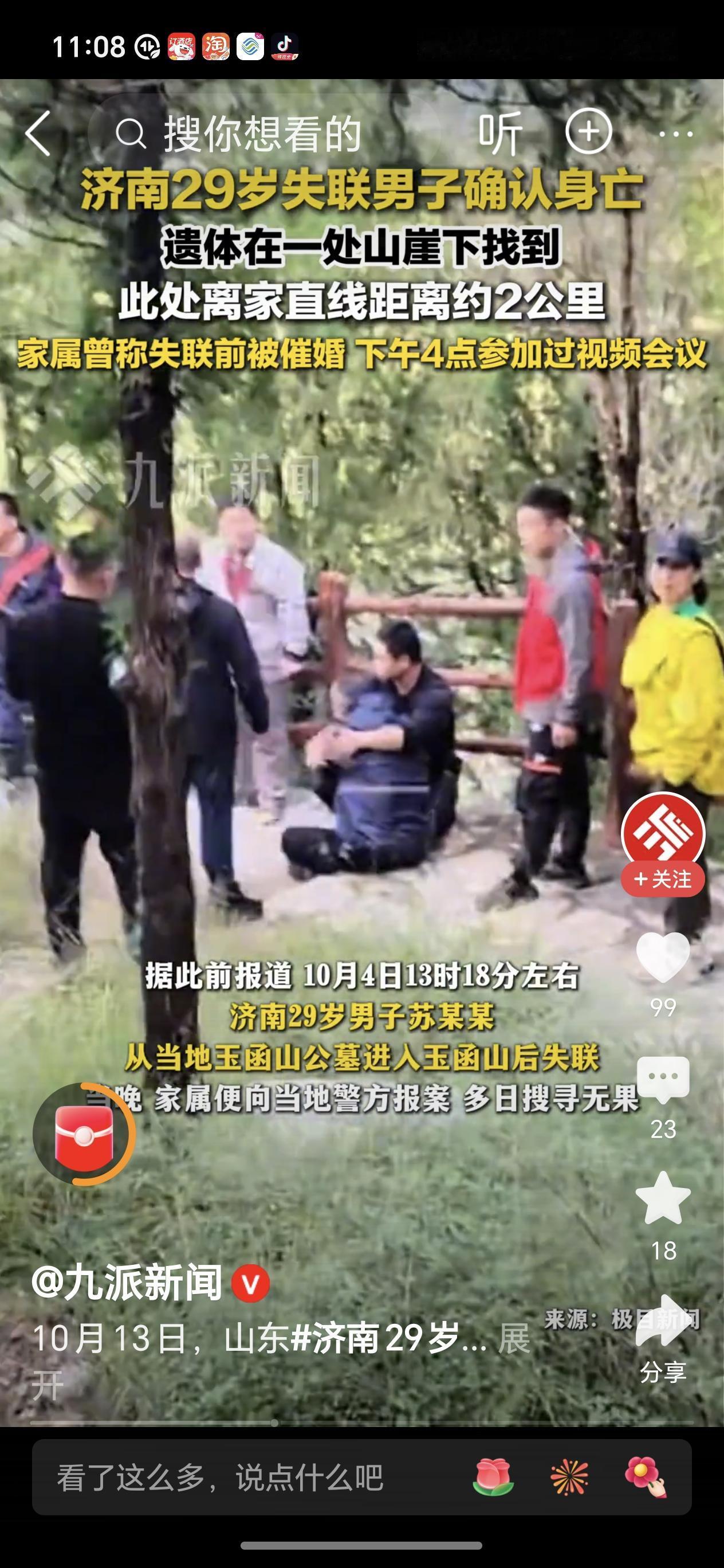 太让人痛心了,济南29岁的失联男子已确认身亡。10月4日,男子和家人因琐事争吵后,从玉函山公墓进入玉函山就失联了。他平时两点一线,性格内向,不太爱交流,离家时没带身份证,只穿了件灰色外套。 之后多日搜寻无果,直到13日下午,遗体在玉函山一处山崖下被找到,这里距他家直线距离才2公里左右。那几天济南一直在下雨,山里夜间气温估计在10℃以下,难以想象他经历了什么。生命如此脆弱,29岁的小伙子就这样说没就没了,太可惜了,希望大家和家人相处多 些理解,珍惜身边人。