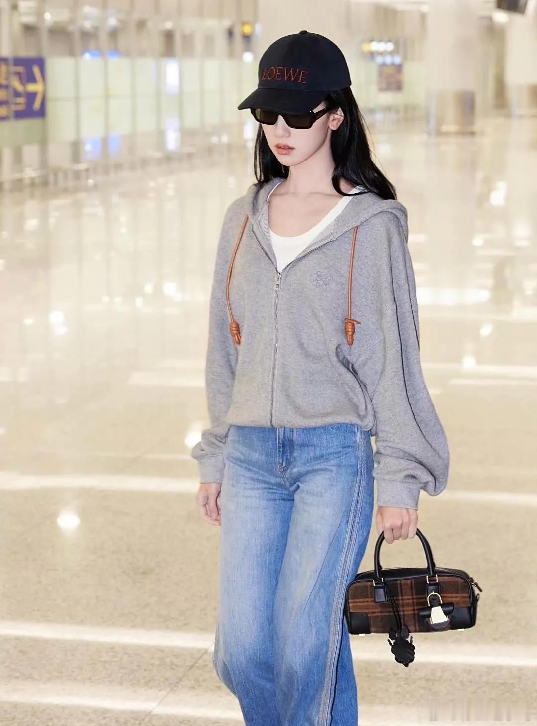 陈都灵机场私服真会穿灰色连帽外套+牛仔裤,休闲随性又时髦!