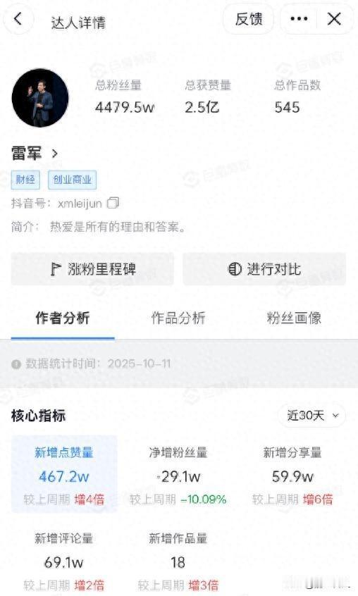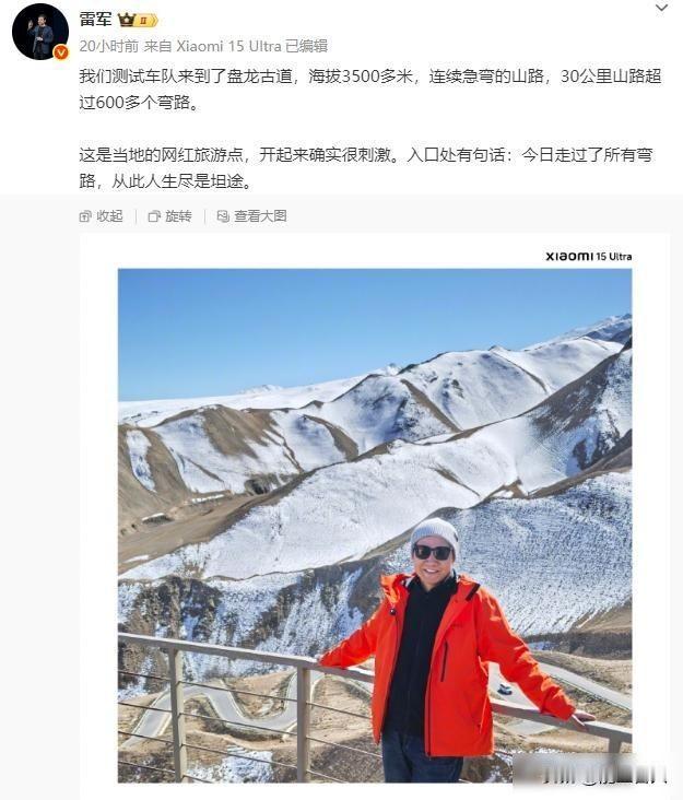 雷军掉粉29万,股价暴跌7%,盘龙古道真能带他翻身? 雷军最近一个月少了二十九万多粉丝,这不是小数目,头一回见这么多人不关注他了,以前大家觉得他能带小米,现在不少人开始琢磨,他还能不能带得好。 小米股价在10月13日跌了超过七个百分点,那天科技股普遍下滑,阿里和百度也跟着往下走,市场情绪低迷,资金流出,大家对未来的预期变得谨慎,雷军作为小米的代表,自然被推到了舆论中心。 他没发产品,也没提业绩,只晒了一张新疆盘龙古道的照片,那条路六百多个弯,海拔三千五百米,他说走完所有弯路,人生就都是坦途,这话听着像说给自己听,也像在告诉粉丝,别急,我在路上。 小米现在真不容易,手机卖不过vivo和OPPO,汽车还在烧钱,技术也被理想和华为甩在后头,雷军一个人撑着公司脸面,业绩一下滑,他的光环就跟着暗了,这时候发张山路照片,不过是想用点人情味,把人心再拉回来。 年轻人现在不太信什么全能老板了,他们更关心产品实不实用,公司有没有裁人,可最近电影电视剧还是总讲逆袭企业家的故事,大家也爱看,雷军这波操作,正好撞上了这股劲儿。 粉丝走了,股价跌了,他倒去爬山,发了张照片,三件事凑一块儿,不是碰巧,就是想换个法子再翻盘,能不能成没人说准,可大家又开始留意他了。