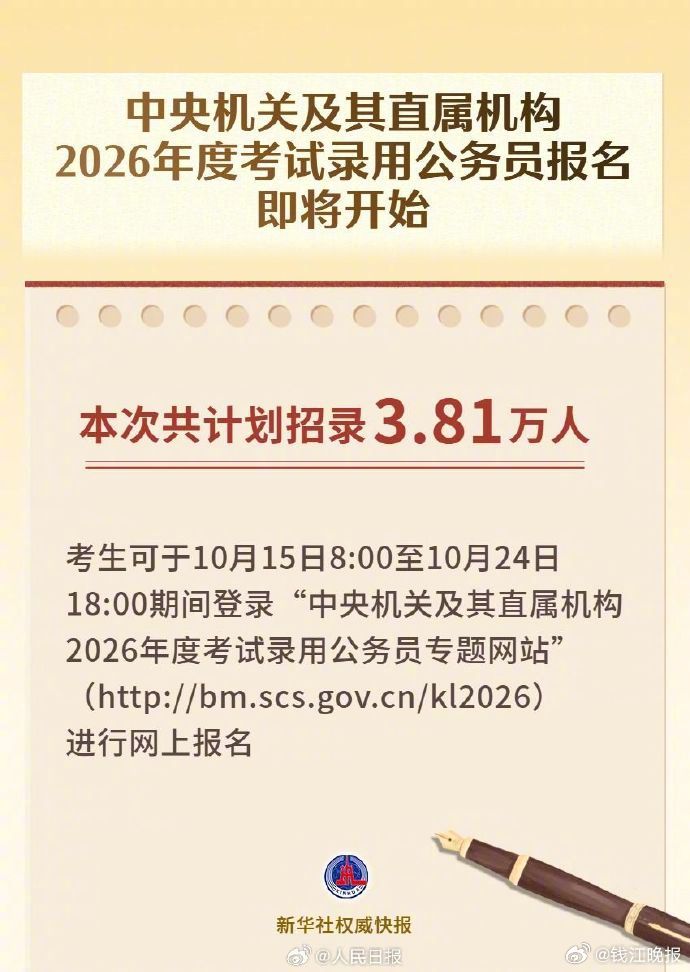 【2026国考明天开始报名】#国考年龄放宽到38岁##国考公告# 中央机关及其直属机构2026年度考试录用公务员报名即将开始,共计划招录3.81万人。考生可于10月15日8:00至10月24日18:00期间登录“中央机关及其直属机构2026年度考试录用公务员专题网站”进行网上报名,公共科目笔试将于11月30日在全国各直辖市、省会城市、自治区首府和部分城市同时举行。(人民日报)