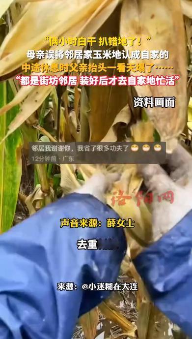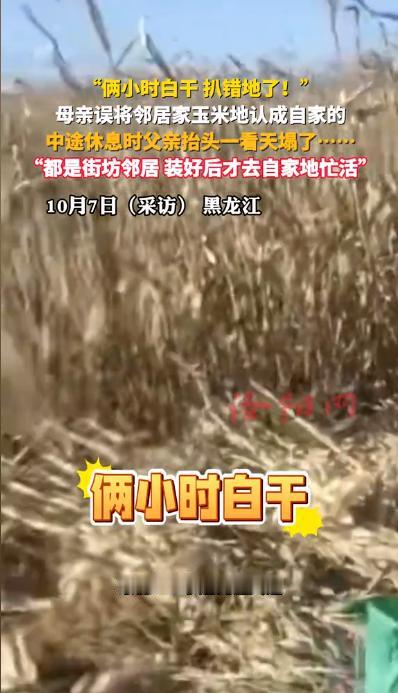 “丢人丢大了!”10 月 7 日,黑龙江齐齐哈尔,一女子领着家人去地里扒玉米。 这女子叫王丽,在市里的超市做收银员,国庆放假 7 天,特意提前买了两双耐磨的劳保手套,想着回家帮爸妈收玉米,她家种了 5 亩 “龙单 38” 品种的玉米,往年这个时候都得雇人,今年她想着自己多干点能省点钱。 那天早上 6 点多就起床了,爸妈已经把三轮车装满了空麻袋,她爸开着车,她和妈坐在车斗里,风一吹还挺凉,妈把提前准备的厚外套给她披上,说 “地里露水大,别冻着”,半小时后到了村东头的地块,远远就看见一片金黄的玉米地,秸秆长得比她还高。 她爸停下车说 “就从这儿开始吧,这块地熟得早”,三人就分头忙活,她爸负责掰玉米棒,她和妈负责把玉米棒装进麻袋,她戴的手套没一会儿指尖就磨白了,玉米叶划得胳膊上一道一道的红印子,可看着装满的麻袋越来越多,她还跟妈说 “今年玉米结得真满,一个棒上最少有 30 行粒”。 干到 8 点多,太阳升起来了,妈说 “歇会儿喝口水吧”,三人坐在地头的石头上,她刚拧开矿泉水瓶,就看见妈盯着不远处的一棵老榆树看,突然说 “闺女,咱家地头哪有这棵榆树啊?我记得咱家地边上是条小水沟啊”。 王丽心里咯噔一下,赶紧站起来往地边跑,仔细一看,地埂上确实没有自家做的记号 —— 往年她们都会在地块四角插红色的塑料旗子,今年因为她爸前段时间腰不好,还没来得及插,再看旁边的地,有几麻袋已经扒好的玉米,上面压着一块青石板,那是邻居张叔家的记号,她脸一下子就红了,赶紧喊 “爸,咱扒错地了!这是张叔家的!” 她爸跑过来一看,也慌了,赶紧掏出手机,翻出之前拍的自家地块照片,对比了半天,确实是错了,两家的地挨着,中间就隔了一道不明显的田埂,今年雨水大,田埂被冲得快看不见了,她赶紧找出张叔的电话,手都有点抖,拨通后说 “张叔,对不起啊,我们把您家的玉米扒了,您快来看看”。 张叔没一会儿就来了,骑着电动车,手里还拿着个收音机,看见她们堆在地上的玉米麻袋,笑着说 “没事没事,我正想着今天下午来扒呢,你们这是帮我忙了”,可王丽和爸妈坚决要把扒好的玉米装到张叔家的三轮车上,还说下午帮张叔把剩下的也扒了,张叔拗不过,从电动车筐里拿出一袋自家炒的葵花籽,塞给王丽说 “尝尝,今年新炒的”。 后来王丽把这事拍了段短视频,发在村里的微信群里,村民们都笑说 “丽丫头这是帮邻居收玉米啊”,还有人说 “我去年收大豆也认错地了,把西头老李的地收了半亩,最后老李还留我吃了顿饭”,网友看到后也评论 “这家人实诚,要是别人说不定就悄咪咪拉走了”。 其实齐齐哈尔市农业农村局 2024 年 10 月 1 日就发布过《秋收地块识别提示》,提醒农户在地块边缘设置明显、耐用的标记,比如刷了红漆的木杆、彩色尼龙绳,还建议用手机给地块拍带参照物的照片,避免认错,王丽后来还把这个提示转发到了村里的微信群,说 “明年咱可得按提示做记号,别再闹这笑话了”。你们秋收或者收庄稼的时候,有没有过这种 “帮别人干活” 的乌龙事呀?