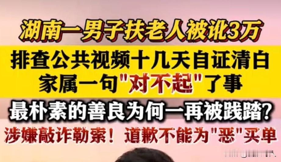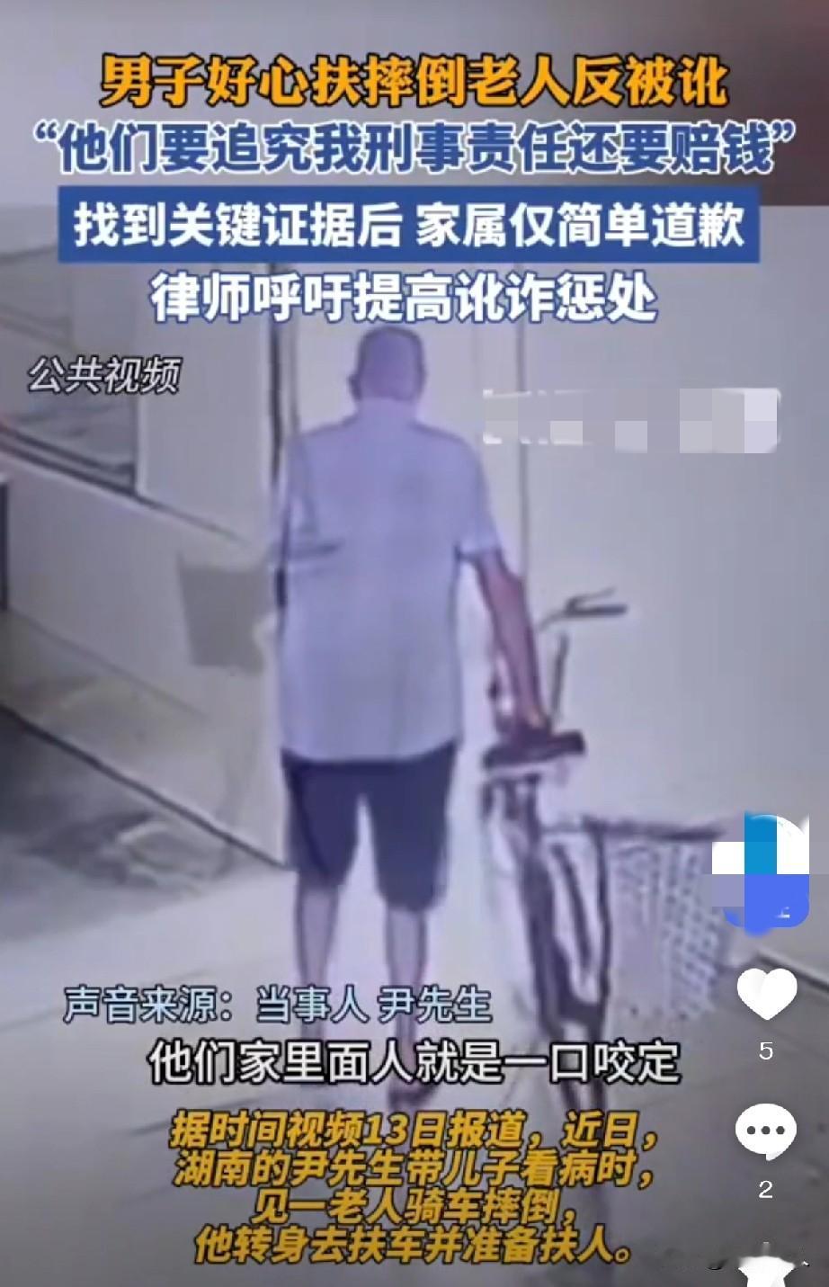 🤔路人摔倒,扶还是不扶? 扶,怕给自己惹一身骚,不扶,过不了良心关 这不,近日又有一起因“扶老人被讹”事件爆出 事情是这样的: 近日,湖南的尹先生带儿子到医院看病,听到老人家摔倒的声音,他毫不犹豫跑过去扶起,几分钟后就默默离开。 本来是觉得看到的人都会做的一件事简单的小事,不曾想,晚上却得知老人家属已报警,指控尹先生“无证驾驶,肇事逃逸,索赔3万元,并追究刑事责任”。 😡更可气的是,家属声称“老人亲口”指认,就是尹先生撞倒的。 尹先生一方面是生气,一方面是苦恼“怎么做好事变成了坏事”,实在无奈,尹先生为了自证清白,十多天跑上跑下,寻找附近监控,最好终于在一个隐蔽的角落的一个摄像头,找到完整的过程影像,证明了自己的清白。 最后,在铁证下,老人家属轻飘飘一句“对不起”便离开。 尹先生表示:老人家年纪大了,不会去追究。但一朝被蛇咬,十年不敢做好事。 💡学雷锋 做好事,扶起摔倒老人是善良的本能,而自证清白,却成了善良的成本,宣扬正能量,不要让去做好人好事变得需要犹豫,莫凉了善良的心。 (消息来源:长江云新闻权威报道) 扶老人被讹 你支持维权赔偿吗 好人好事 善良