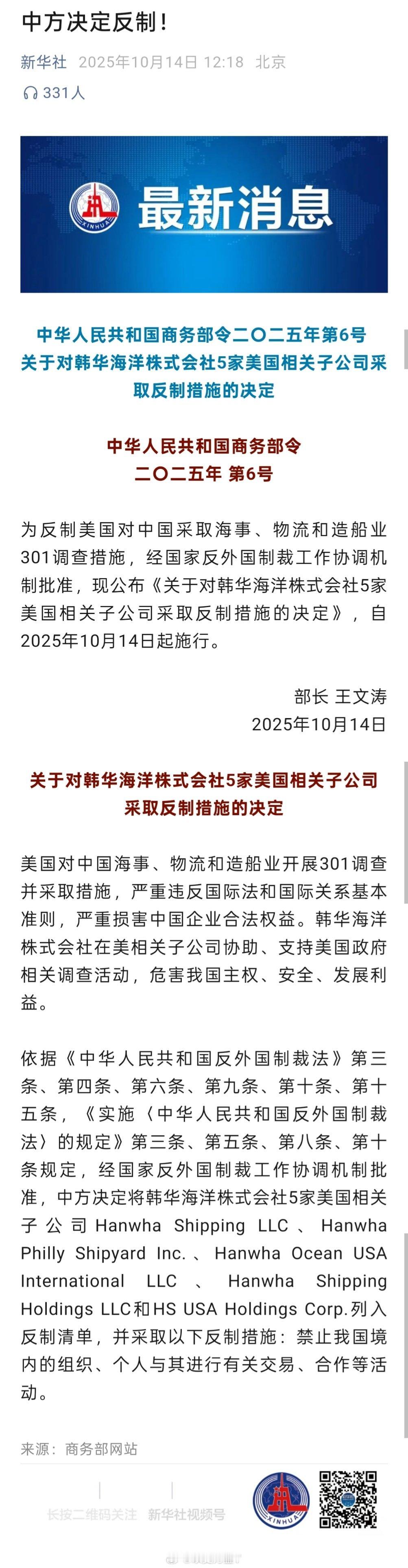 根据新闻上看,韩华5家美国子公司【协助、支持美国政府对中国海事、物流和造船业开展301调查并采取措施。】……