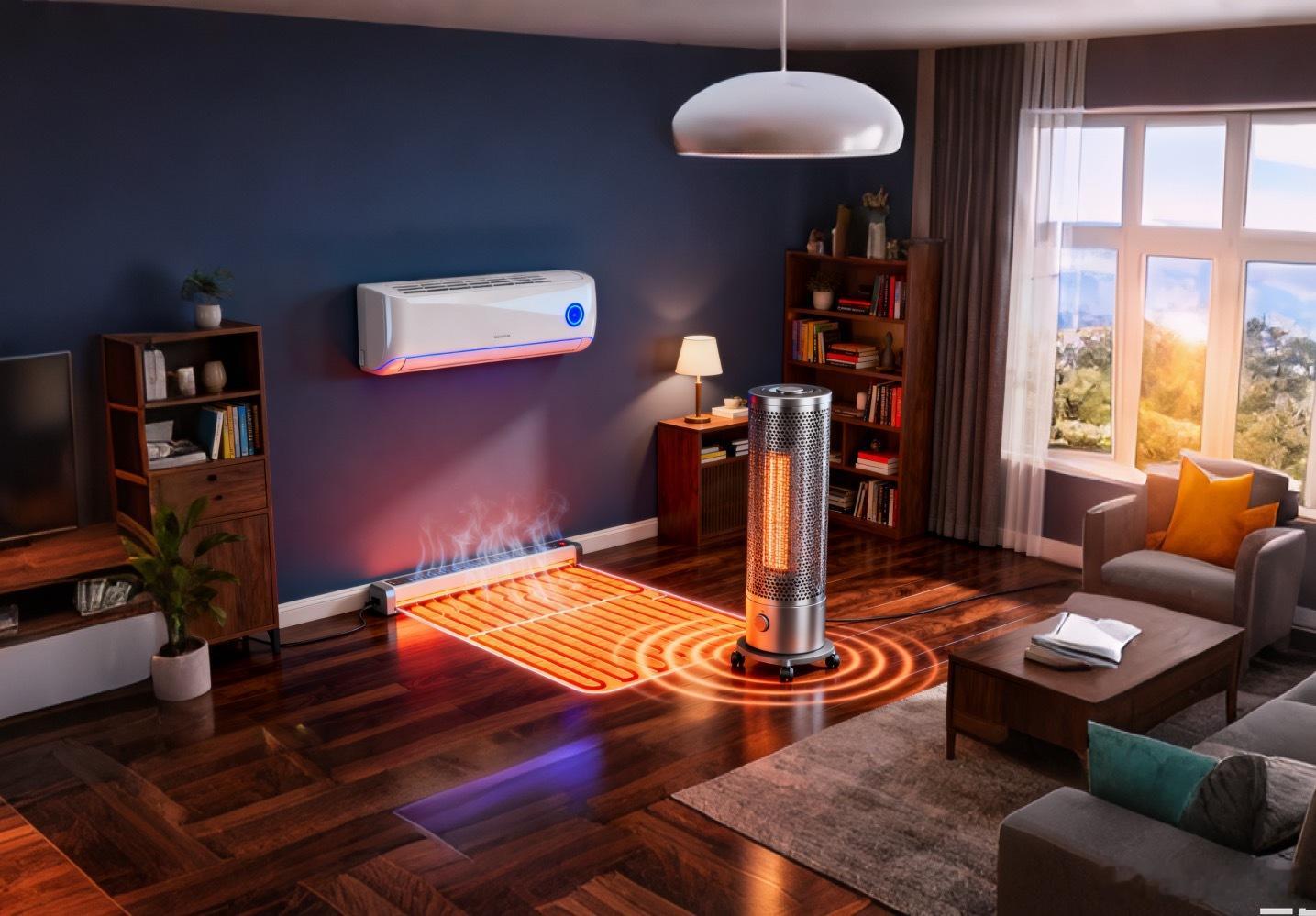 全屋升温选空调:客厅或大卧室,1.5匹变频空调往往比电暖器更省电。热量循环覆盖广,长时间开着更划算。