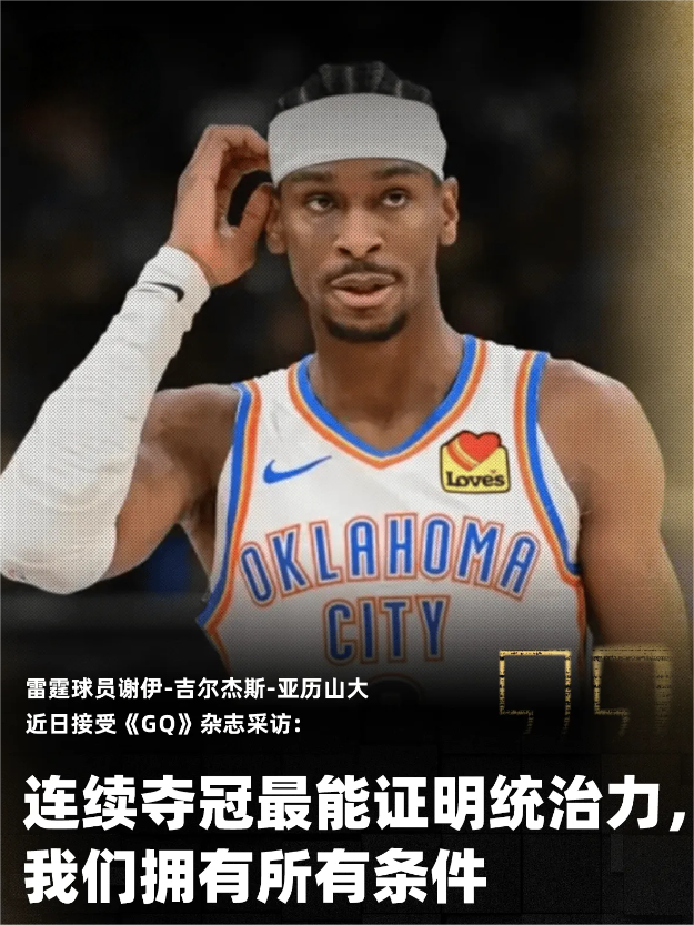 雷霆球员谢伊-吉尔杰斯-亚历山大近日接受《GQ》杂志采访。 亚历山大认为成功的真正标志在于延续雷霆队的继续赢的势头。 "核心在于:在你的时代能缔造多大统治力?连续夺冠无疑最能证明这种统治力。我们绝对拥有连续夺冠的天赋、阵容、化学反应和经验。但从现在到2026年6月,还需要太多环节完美衔接。"
