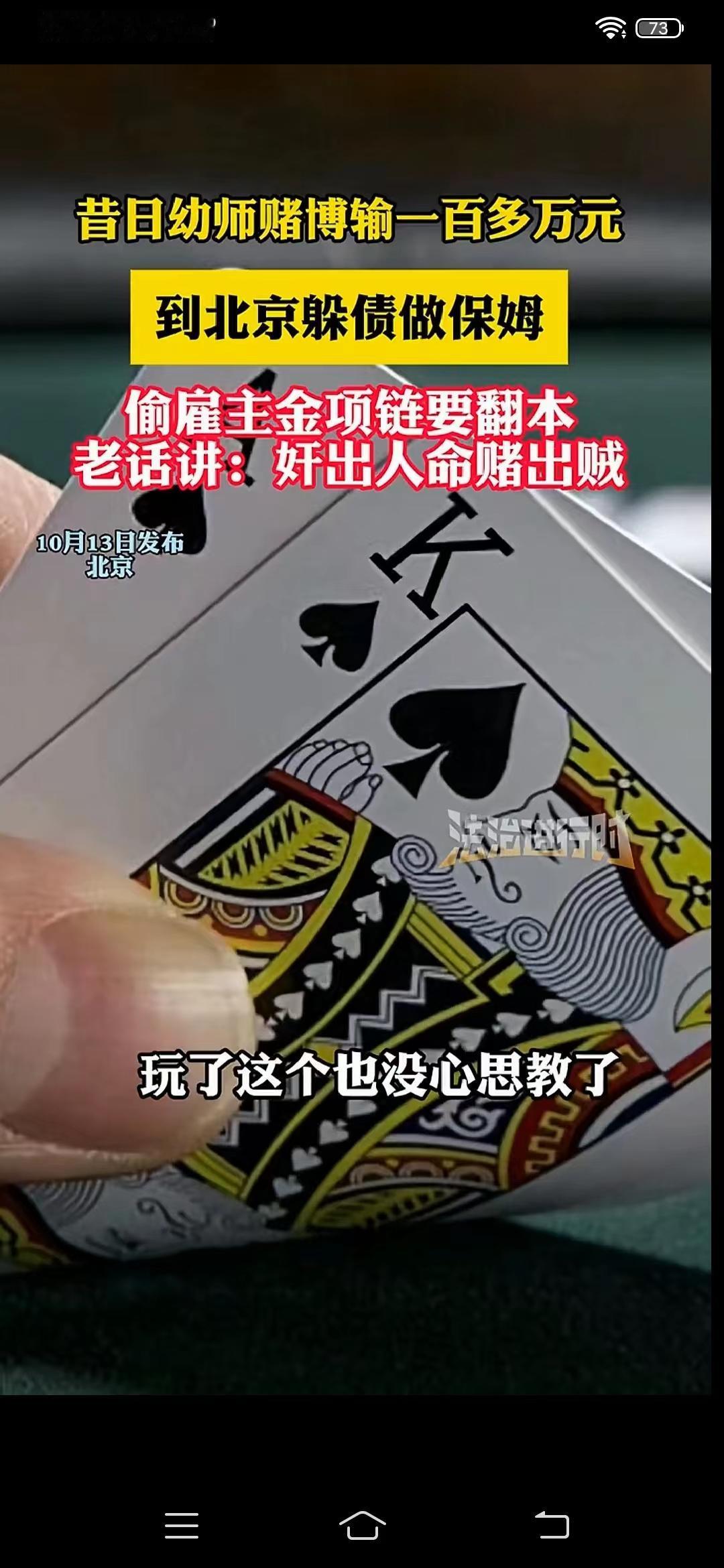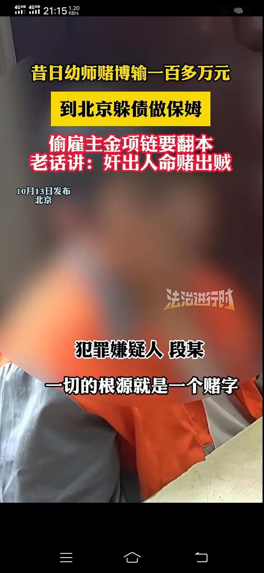 赌掉100多万又偷 栽了 赌博也是有瘾的,赌徒有个共性就是很自信,很相信自已的技术,只会抱怨自己的运气不佳,输钱就是因为自己运气不好,运气好了还不是可以大把大把的赢钱,所以,赌博还是有瘾的,是很难断掉的。 10月13日,一女子段某曾是幼儿园老师,因迷上赌博欠债100多万,为了逃避追债,无奈,女子只有跑到北京去当保姆,但赌输这口气她总是不服,她认为只要有本钱,让她再去赌,她一定能把输掉的100多万块钱赢回来,她很自信也很胆大,她动起了歪脑子,她要搬本,她看上了主人家的大金链了。 大金链子偷到手了,但很快主人家就怀疑上了她,报警后,段某就被抓起来了,这下完了,少说也得踩三四年缝纫机。