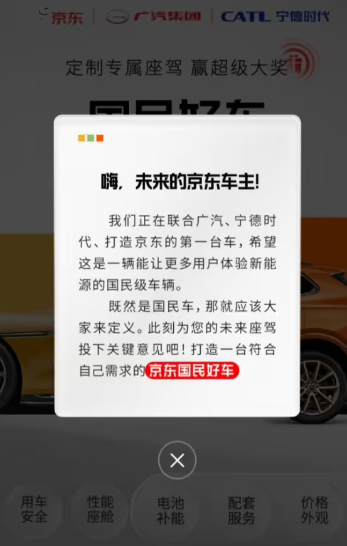 今日,京东宣布联合宁德时代、广汽共同推出一款“国民好车”。将于双 11 期间正式发布,并于京东平台开启独家销售。