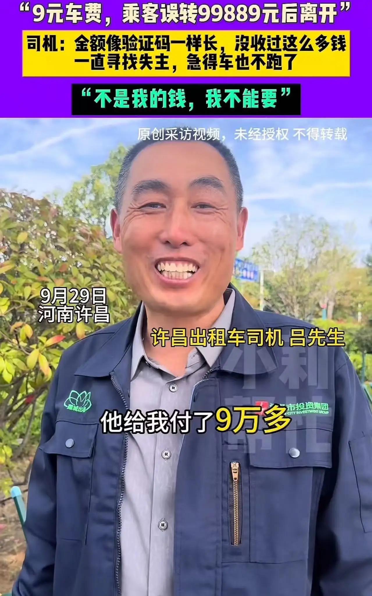 这个出租车司机火了!”河南许昌icon,乘客误将9元车费转成99889元,出租车司机发现这笔“天降横财”以后,毅然而然地做出一个感人的举动!网友:羡慕他打车能遇到这样的司机,更羡慕他的余额,我犯不了这样的错。 这个出租车司机火了!河南许昌的这位普通司机,竟然成为了网络热议的“英雄”。事情的起因简单又荒诞:一位乘客误将9元车费转成了99889元!看似天降横财,但背后隐藏的,却是一段令人动容的故事。 事情发生在一个平凡的早晨。那位乘客刚刚结束了一天的奔波,心情复杂,手指一滑,误操作了转账金额。原本只打算付9元,却不料输入了99889元。收到转账的瞬间,司机的手机“叮咚”响起,他一看,竟然是几万块钱的转账通知!这笔“天降横财”让他一时间既震惊又困惑。 然而,令人意想不到的是,面对这笔巨款,许昌的这位出租车司机没有像普通人那样,心生贪念,打算私吞。他的第一反应,反而是立刻联系乘客,确认这笔转账是否真的无意中发生。乘客当场也惊呆了,连连道歉,感激司机的诚信。 更令人动容的是,司机的反应——他没有选择私藏这笔钱,而是主动要求乘客确认后,将款项退还。这个决定,瞬间点亮了网友们的心。有人说:“这样的司机,值得我们每个人学习!”有人评论:“遇到这样的诚信司机,打车都变得温暖了。”更有人说:“羡慕他打车能遇到这样的司机,更羡慕他的诚信和善良。” 这件事背后,折射出人性中最美好的一面:诚信、善良和责任感。在这个浮躁、功利的社会,能遇到这样一位“暖心司机”,无疑是一种难得的幸运。他用实际行动告诉我们:面对诱惑,保持初心,坚守诚信,才是真正的“天降横财”。 这不仅仅是一则新闻,更是一面镜子,让我们反思:在这个充满诱惑和挑战的时代,或许我们更需要的是像他一样的善良和坚守。也许,他的行为会激励更多人,重新审视自己的人性,重新点燃那份最纯粹的善意。 你是否也曾遇到过类似的“天降横财”?又是否在关键时刻,坚守了自己的底线?让我们一起来为这位许昌的“诚信司机”点赞,也希望这个社会,能因为更多像他一样的人,变得更加温暖和美好。出租车司机 这位司机善意好感动 出租车天价订单 ′