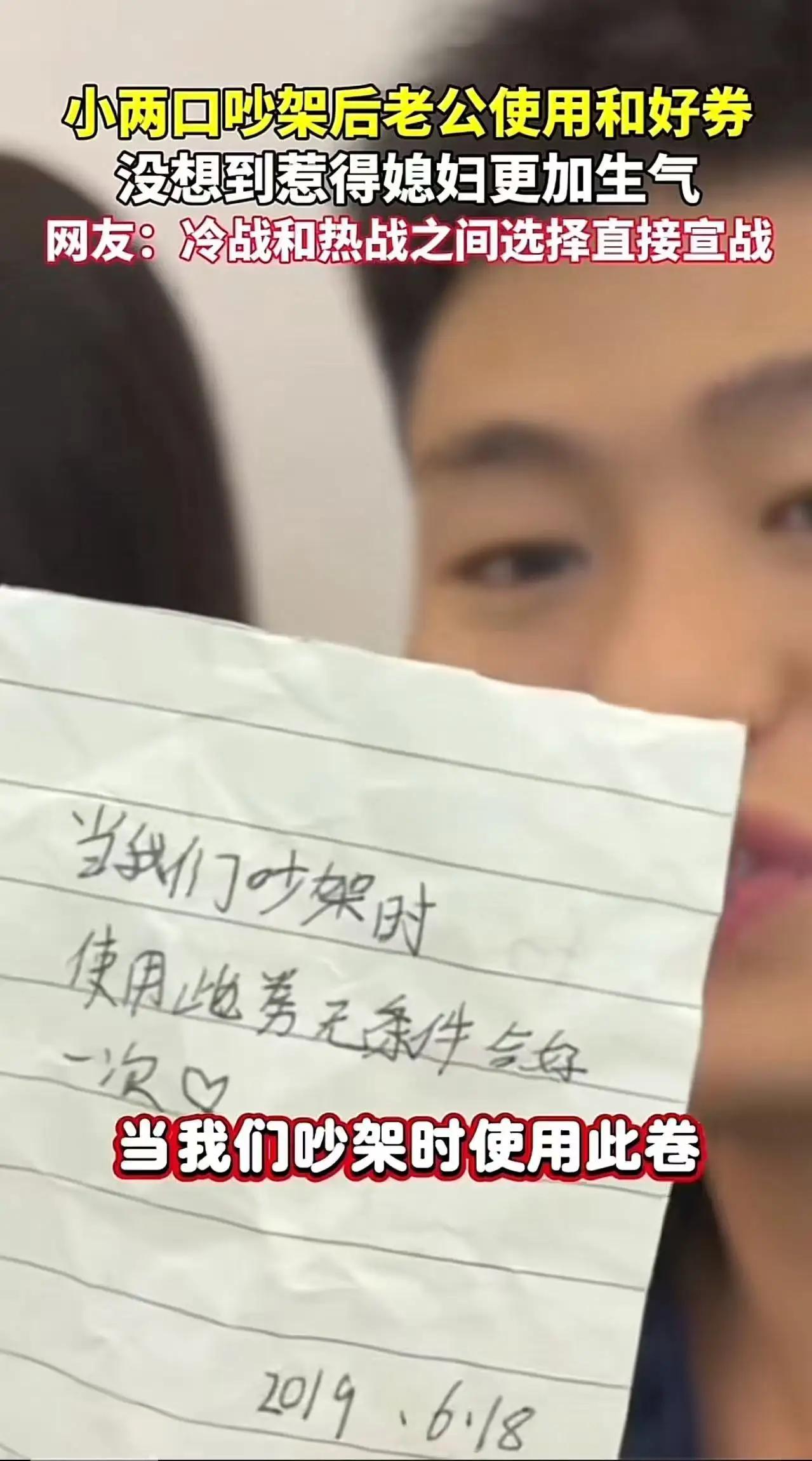 笑不活了!小两口吵架后,老公拿出了珍藏的和好券,没想到惹得媳妇更加生气!网友:冷战和热战之间直接选择了宣战! 事情的经过令人哭笑不得。那天,原本只是一次普通的争执,谁知道升级成了“家庭战争”。老公心血来潮,从抽屉里掏出那张“和好券”,满心期待用这个“秘密武器”来缓和气氛。谁曾想,媳妇看到后,不仅没有一丝温柔,反而怒火更旺了。 “你以为用个券就能让我原谅你吗?”媳妇气得直跺脚,“你以为我不知道你早就准备好了这个?你这是在玩我吗?”话音未落,气氛瞬间紧绷到极点。老公一脸懵圈,试图解释“这是我特意准备的惊喜”,但显然,这个“惊喜”变成了火上浇油的导火索。 网友们看得津津有味,纷纷评论:“这是典型的‘冷战’变‘热战’的升级版。”有人说:“真是笑死我了,夫妻之间的‘战争’比电视剧还精彩。”也有人感叹:“家庭里的小摩擦,往往因为一根火柴变成了熊熊烈火,关键还是心里的那份不信任。” 其实,这个故事折射出许多家庭中普遍存在的问题——沟通的缺失和情感的脆弱。你以为一张“和好券”可以轻松解决所有问题?但实际上,家庭的和谐不是靠“券”或者“礼物”堆出来的,而是需要彼此的理解、包容和耐心。 这个事件也让我们反思:在家庭生活中,冷战和热战到底哪个更可怕?有人说,冷战像一场无声的战斗,慢慢蚕食着感情;而热战则像一场火山爆发,瞬间摧毁所有的温情。其实,最怕的不是哪一种,而是我们没有找到正确的“调和剂”。 家庭,是两个人的修行场。遇到矛盾时,或许我们都需要学会用心去倾听,而不是用“券”或“惩罚”来解决问题。毕竟,家庭的温暖,来自于每一次真心的沟通和包容,而不是一张“和好券”。 这次的“和好券事件”,让我们看到,爱情和婚姻里的“战斗”其实并不可怕,可怕的是我们没有用正确的方式去面对。只要我们愿意用心去经营,哪怕是最激烈的争吵,也能变成彼此成长的契机。毕竟,家庭的幸福,从来都不是一蹴而就的,而是每一次包容和理解累积而成的温暖。跟爱人吵架 两夫妻吵架