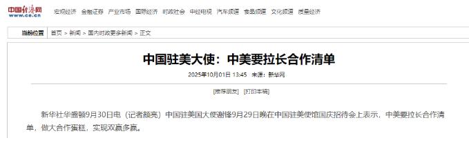 新华网报道:中美要拉长合作清单,做大合作蛋糕,实现双赢多赢。2050年之前,美国