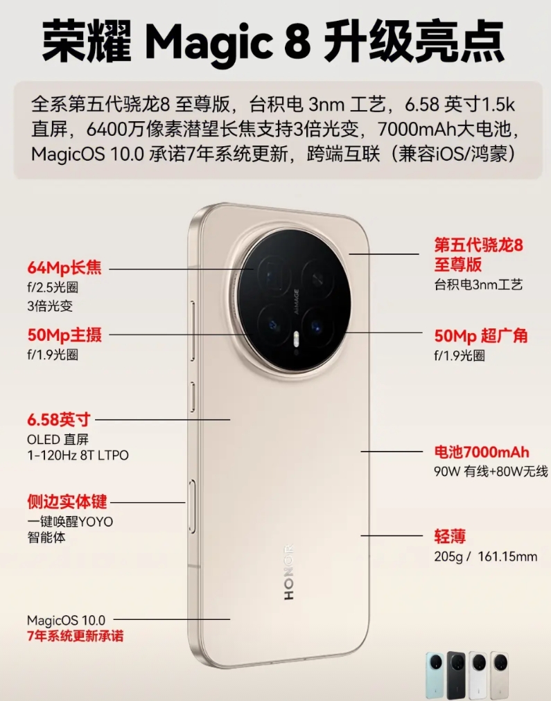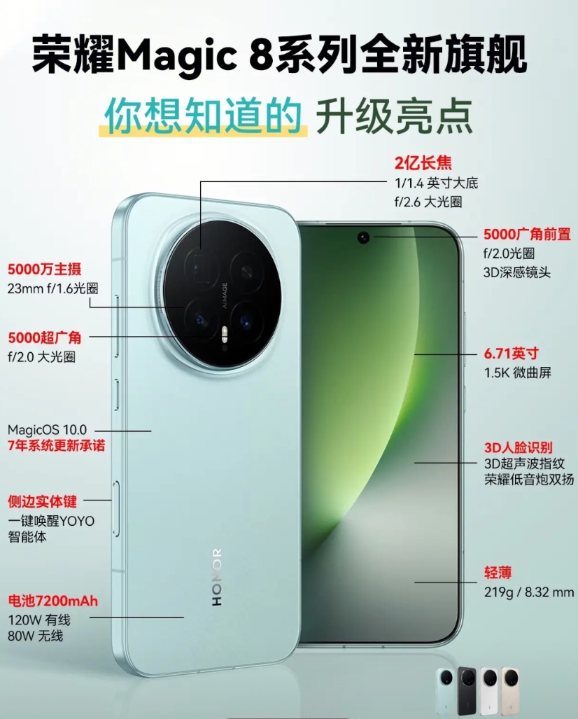 荣耀Magic8系列这么强,那具体都有哪些提升呢?首先性能方面用上性能更强的第五代骁龙8至尊版芯片,2亿长焦主摄,7k+大电池,新增了侧边实体键可以一键唤醒YOYO,还有3D人脸的加持,可以说简直不要太香了!
