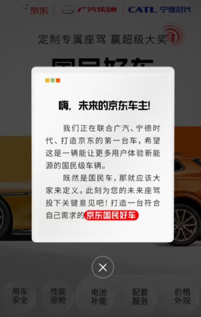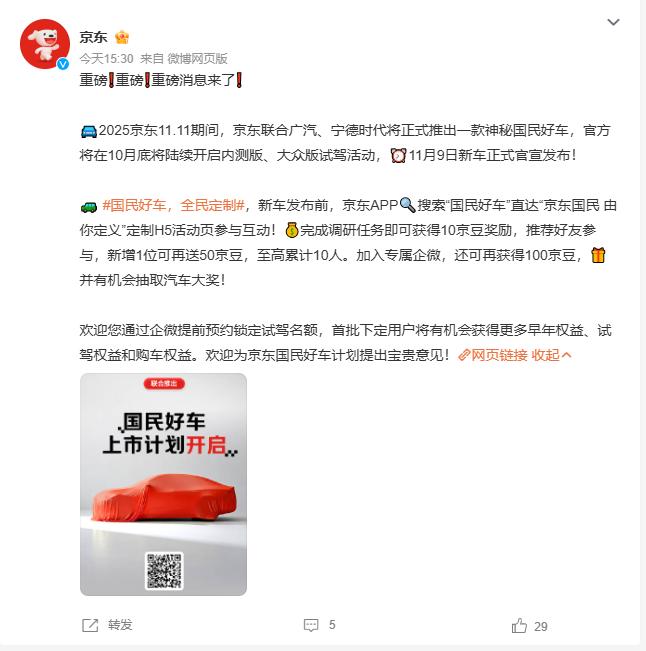 京东要和宁德时代、广汽一起搞事情!三巨头准备联手推“国民好车”了![吃瓜群众] 京东(渠道/生态)+ 宁德时代(电池/换电)+ 广汽(制造/整车技术),这阵容真够强大的~ “国民好车” 听着就很亲民,难道是瞄准10万内市场? 新车在京东平台独家销售,双11期间正式发布 —— 这是要给大家的购物车再添一个“大件”? 目前京东App已上线活动页面,可填写外观、价格、配置等需求 —— 还没出生就开始“用户共创”了? 京东这波操作,直接把汽车销售的战场搬到了电商主场,这是要革传统4S店的命,还是真能开辟一条“国民购车新路径”?[思考] 大家觉得这款“国民好车”卖多少钱才算真·国民?评论区聊聊!
