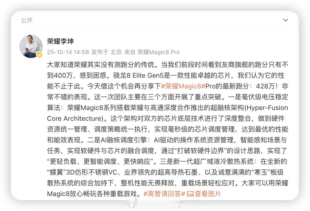 荣耀高管回应Magic8跑分 都是相同的芯片为啥荣耀Magic8系列这么猛?常温跑分就能达到428万分是不是万万没想到。