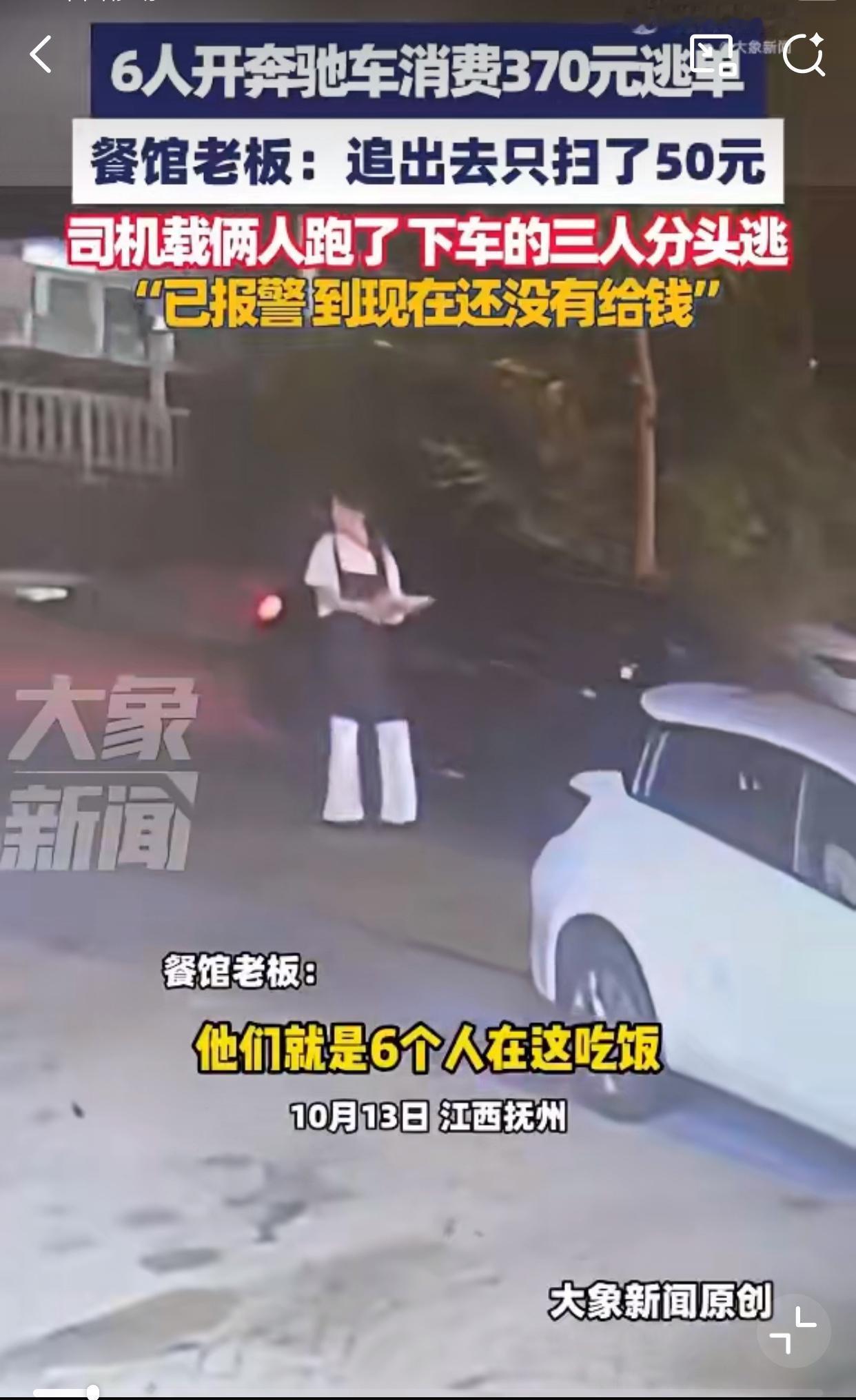 打肿脸充胖子! 江西抚顺,10月13日夜晚,有六个人开着一辆奔驰E300到一家纸包鱼店内用餐,消费了370元! 用餐结束后,6人先后走出店内,老板让给钱,其中一男人扫码后磨磨蹭蹭的付了50元后,准备驱车逃离,老板追上去后,车上三人立马跑下车往四周跑去,开车得则赶紧拉着剩下两人驱车逃离了!之后老板报警,但截止目前还未收到剩余的320元! 物以类聚人以群分,6个人凑不出370元,老板又气又好笑的,以前遇到逃单的都是鬼鬼祟祟,趁人不注意跑的,这还是第一次遇到开着奔驰当着你的面光明正大的逃单…. 这事最刺眼的就是奔驰车标和370元形成了鲜明的对比,是真没钱还是找刺激呢?如今很多年轻人,开好车,穿好衣,兜里却100块都拿不出来,为了维持外在的体面,不停的透支着自己的信用,而真正的体面不在这些标标上,是在结账的举手投足之间!