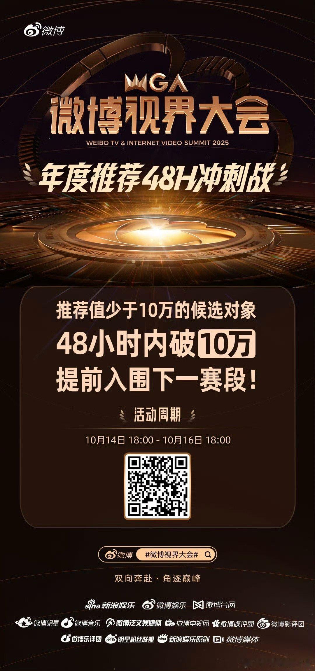 微博视界大会48小时冲刺战 入围赛卷到半程,“48H冲刺战”直接炸场!只要推荐值没过10万的候选,48小时内哐哐冲到10万+,就能提前解锁下一赛段!别犹豫,快给你爱的TA猛猛投票,助TA在巅峰战里杀疯! ​​​