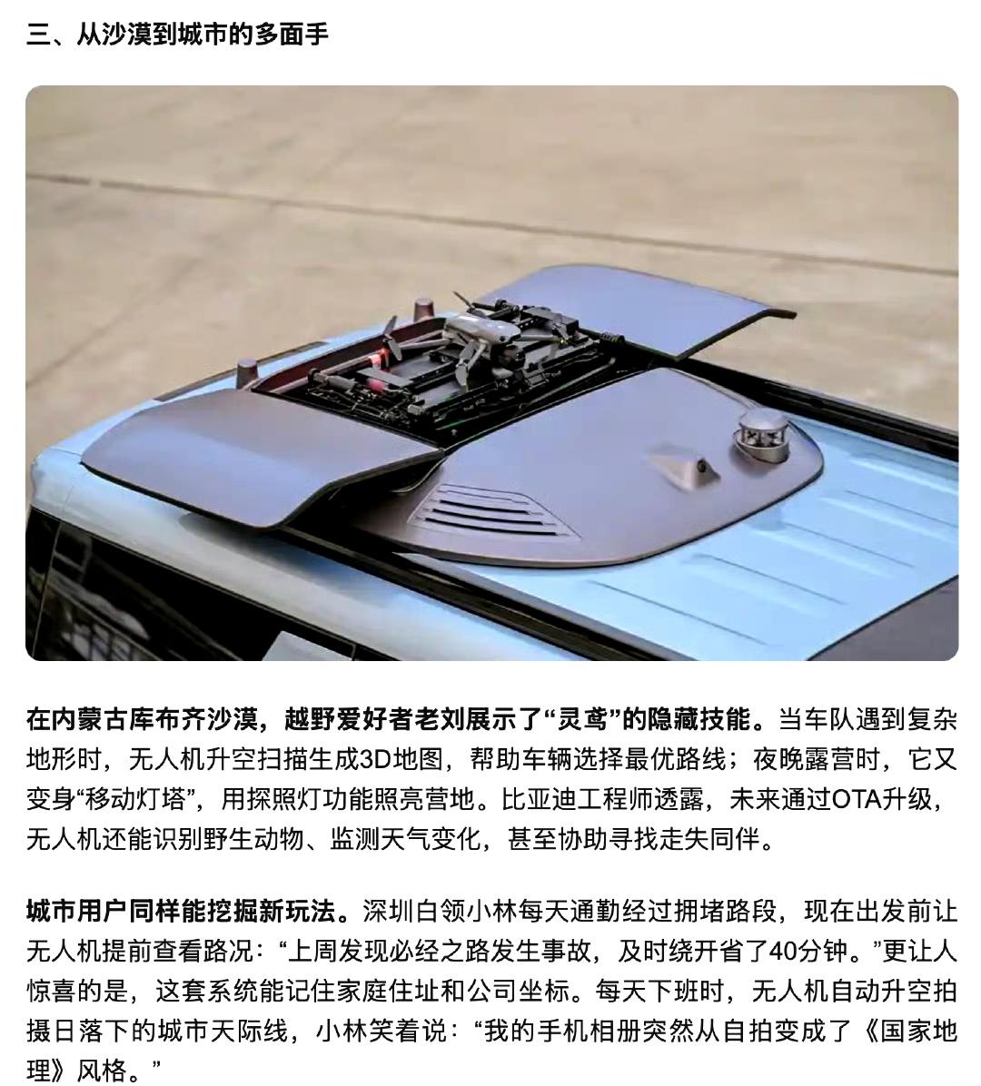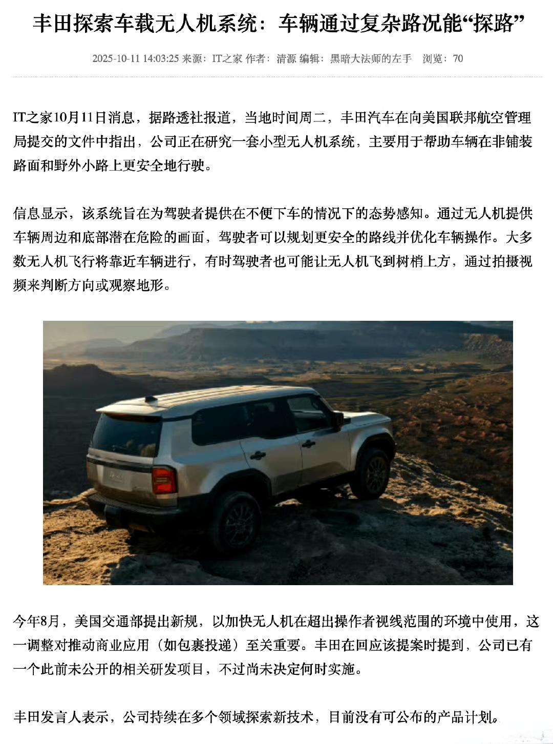 以后,车载无人机也许会成为一个方向,特别是越野车赛道。 以前,是我们拿市场换技术,学习别人;现在市场变了,开始学习我们了。 比亚迪如今走在了行业前沿,灵鸢智能车载无人机系统上市很久了,如今丰田才开始发布,落后的有点多啊!