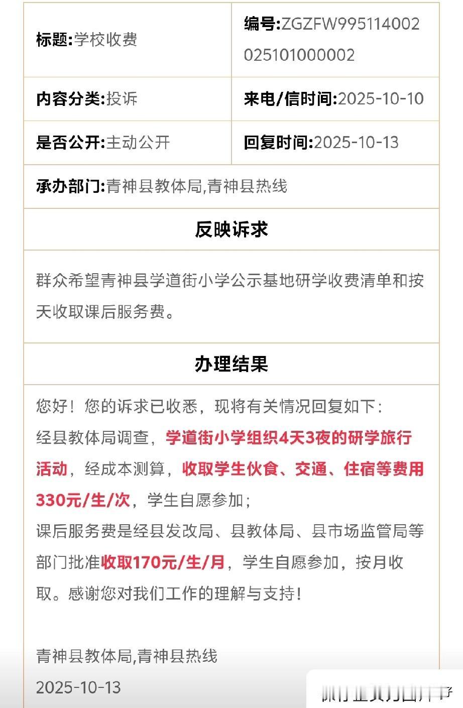 眉山有群众反映希望青神县学道街小学公示基地研学收费清单和按天收取课后服务费。 青神县教体委回复:组织4天3夜的研学旅行活动, 收取学生伙食、交通、住宿等费用330元/生/次,学生自愿参加; 课后服务费是经县发改局、县教体局、县市场监管局等部门批准收取170元/生/月,学生自愿参加,按月收取。 现在学校一般每年都会组织研学活动,330元 ÷ 4天 ≈ 82.5元/天。这82.5元要覆盖三餐、住宿、交通、景点门票、导师费用、物料、保险等。4天3夜330块钱还是不贵,这种大多数都是外包,希望公示收费清单,这个要求是完全合理的。虽然价格本身很低,但“阳光是最好的防腐剂”。详细的费用构成公示(例如:交通费XX元、住宿费XX元、餐费XX元、课程费XX元等)可以让家长消费得明明白白,也能消除大家对是否存在“隐性利润”或“利益输送”的疑虑。这也是对学校公信力的一种建设。孩子们还是很喜欢这种活动的,可以不上学出去玩当然开心。 课后服务费已经收了很多年了,四川估计大部分学校都是这个价格左右,初中可能要高一点。这个价格主要用于支付参与课后服务的教师、外聘人员的劳务补助,以及水电、物料等耗材费用。希望“按天收取”,这个诉求可以理解,因为学生可能因请假、生病等原因无法全程参加。但学校统一“按月收取”是更普遍的管理方式,简化了财务工作流程。