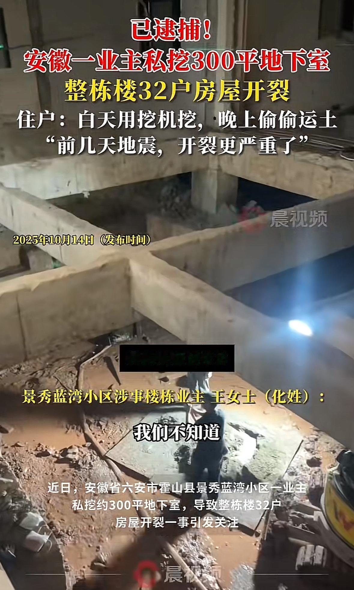 在楼下偷偷挖了一个300平的地下室,这是想把自己埋了。还是要让整栋楼32户人家一起陪葬啊!这事儿发生在安徽六安霍山县锦绣蓝湾小区。邻居们说了这家人为了掩人耳目,白天用挖掘机轰轰地挖,到了深更半夜再偷偷地把一车车的土运出去。更绝的是他们在施工区周围竖起了3米多高的围挡!门一锁俨然是一个“独立王国”就这样神不知鬼不觉地在楼底下掏出了一个深3.7米,面积达300平方米的巨大空间,比整套房的面积还大。 整栋9层楼房从1楼到顶楼32户人家无一幸免,家家是墙面开裂,雨水是直接从屋里渗。 专业检测机构,这栋楼已经被评为C级危房了 现在事情闹大了当地建筑等部门,成立了工作组。
