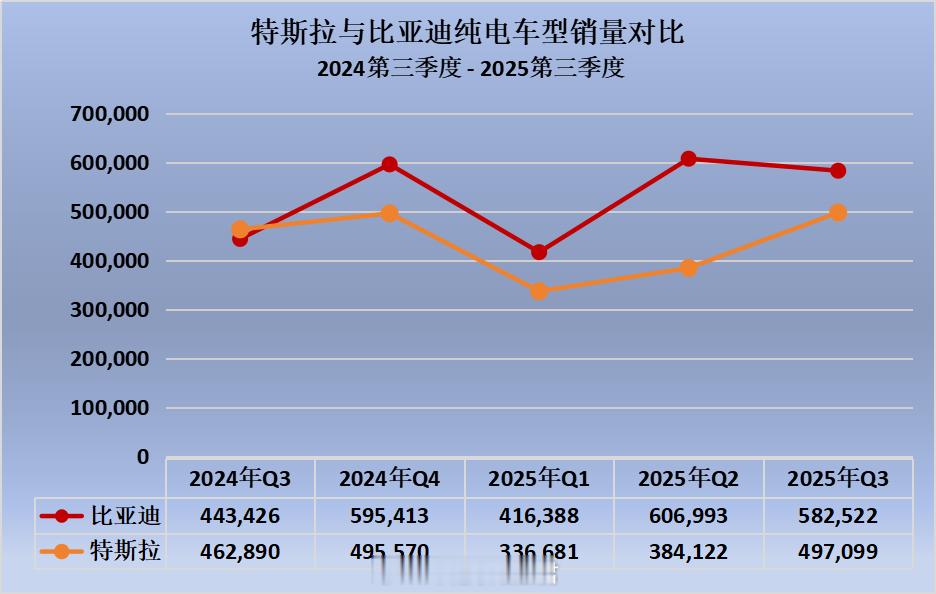 被比亚迪今年的表现惊到了!从去年第四季度到今年第三季度,比亚迪已经连续四个季度在纯电车型销量上超过特斯拉,而且今年前三季度直接领先特斯拉38.8万辆!这是什么概念?差不多是很多品牌一整年的销量了……