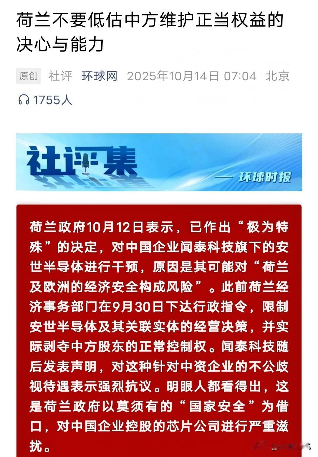 荷兰这步棋走得太臭了,分明是要为自己的无理行径付出惨痛代价!环球时报已发社评警告:千万别低估中方护权益的决心与能力!中美贸易战正酣,这小国竟甘当美国仆从,拿莫须有理由抢中企心血,这就是明抢。 10月12日荷兰官宣实锤,对闻泰旗下安世半导体动手了。早在9月30日就下了指令,冻结全球30个主体资产,还剥夺中方控制权,理由扯得离谱,“威胁欧洲安全”却拿不出证据 。 安世可不是小公司,2024年营收高达147亿元,是全球车规级芯片龙头。欧洲大众、宝马都靠它供货,德国工厂的IGBT模块占欧洲需求43%,荷兰这是砸自己饭碗。 很明显这背后全是美国的影子。9月美刚收紧对华限制,荷兰就跟上,连ASML都被迫停供两款DUV光刻机,要知道中企年需求占其产能15%。这哪是自主决策,分明是被美国当枪使。 双标嘴脸更刺眼!美企向华出口受限芯片只罚款,德企涉导弹部件仅整改,中企没违规却遭抄家式干预,欧洲同类案件要审92天,这案7天就判。 中方已亮明态度!10月13日外交部放话,《反外国制裁法》就是后盾,商务部还启动了贸易调查。ASML更慌,2024年对华营收占18%,这是薅羊毛薅到铁板上 。 我个人认为,荷兰是揣着明白装糊涂,为抱美国大腿践踏规则,简直得不偿失。中企正加速替代,士兰微等扩产,欧洲车企先慌了,这是典型的搬起石头砸自己的脚。 荷兰打错了算盘,以为靠美国就能高枕无忧,却忘了自己的经济命脉早与中国绑定。这种损人不利己的勾当,注定引火烧身、自食恶果。对于这一件事情,你们是不是还有其他不同的见解?可以一起来讨论一下!荷兰芯片战略 荷兰新规 荷兰冲突 荷兰对美。。。 荷兰新闻 荷兰政府干预 荷兰经济