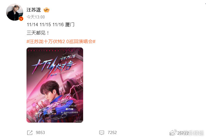 汪苏泷演唱会厦门站官宣厦门的粉丝幸福了,汪苏泷演唱会厦门站连唱三天,11月14.15.16日三天都见[期待][期待][期待]汪苏泷十万伏特2.0巡回演唱会