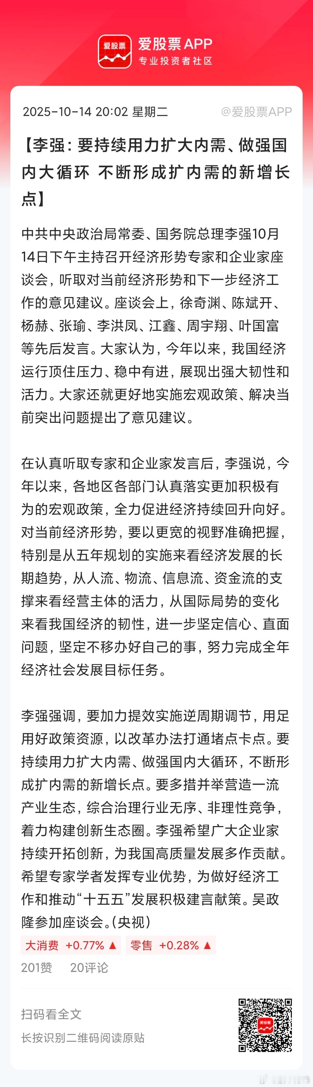 今天召开的经济形势专家和企业家座谈会,强调要持续用力扩大内需、做强国内大循环,不断形成扩内需的新增长点!“持续用力”这个词,意味着可能会很快要出点政策了。