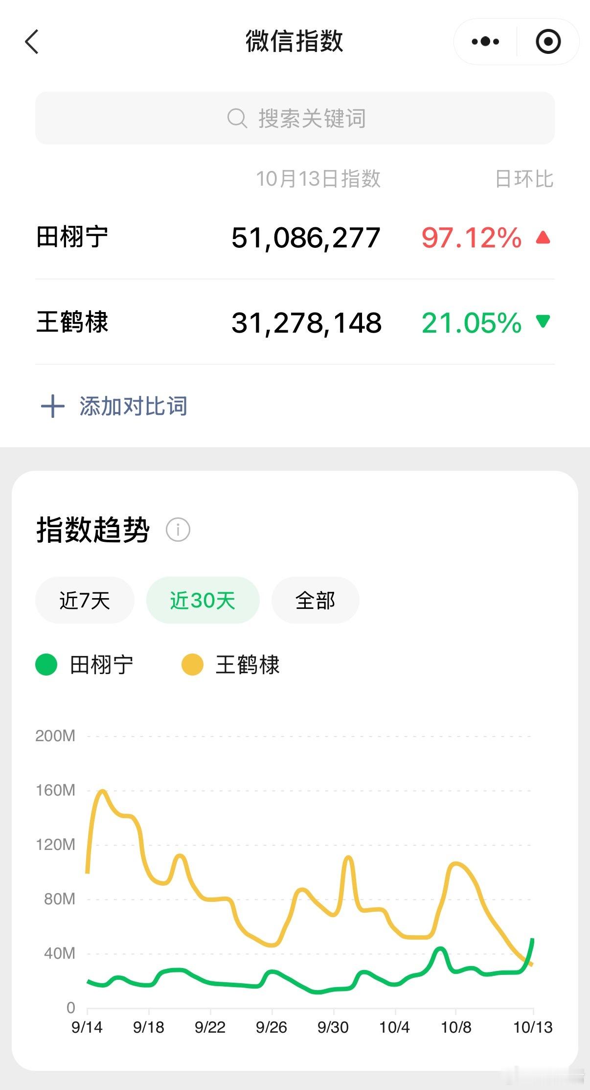 微信指数:田栩宁5100w 王鹤棣3100w