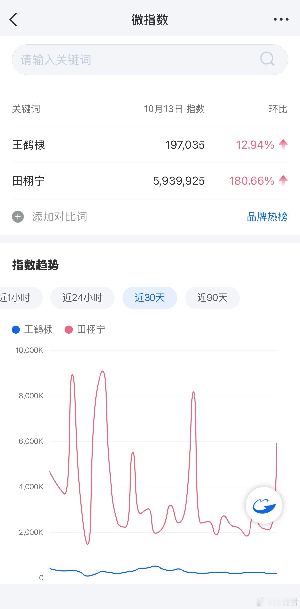 微博指数:田栩宁593w 王鹤棣19w