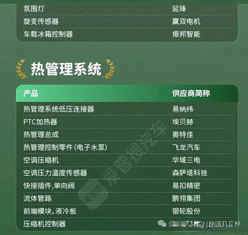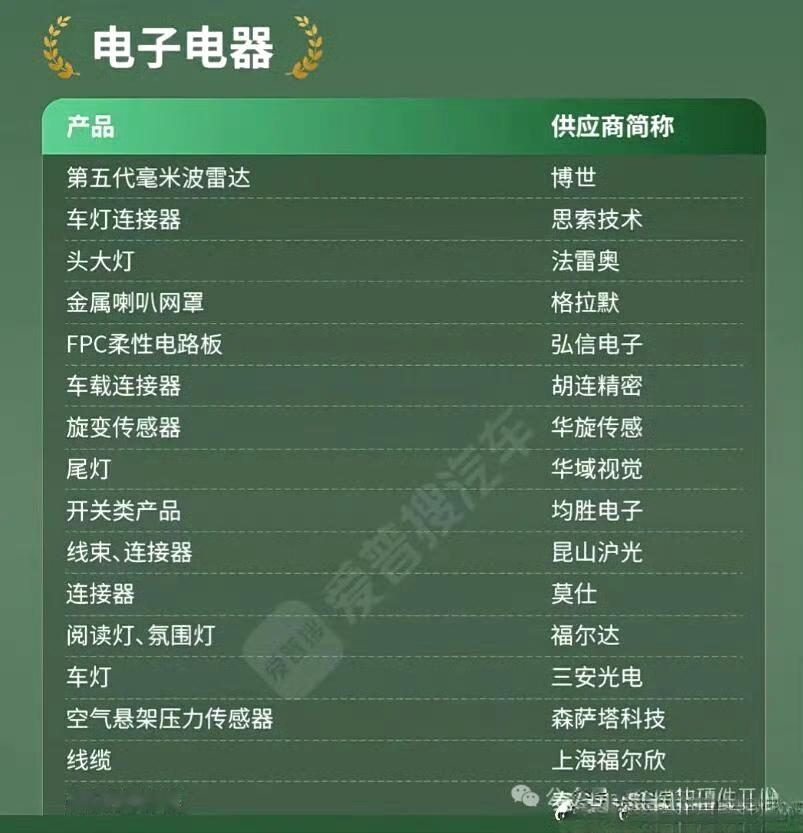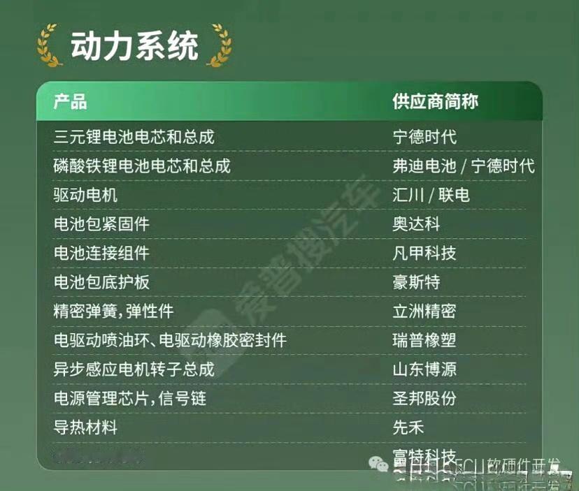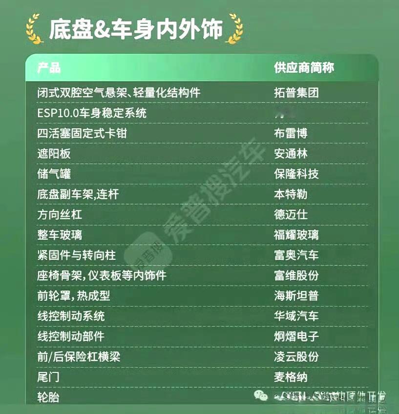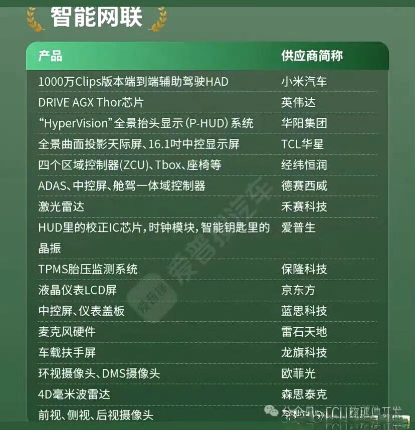 分享一下小米YU7的核心零部件供应商信息: 电池: 弗迪和宁德时代 电机: 汇川和联电(博世) 智驾芯片: 英伟达 域控制器: 经纬恒润 ADAS控制器: 德赛西威 毫米波雷达: 森思泰克 毫米波雷达: 博世 ESP: 博世 空悬: 拓普集团 卡钳: 布雷博 线控制动: 华域 空调压缩机: 华域【来自懂车帝车友圈】