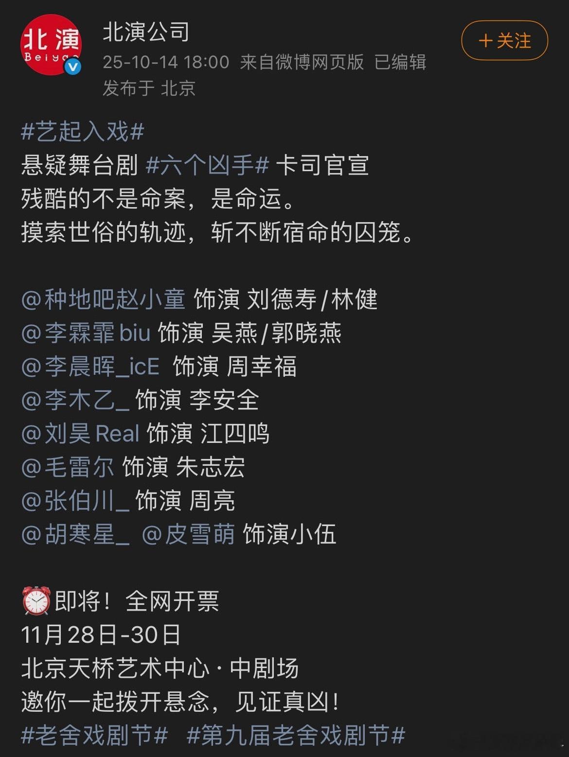 赵小童六个凶手首演 赵小童的首演《六个凶手》真是让人期待!这场话剧不仅有悬疑的气氛,还能看到他一人分饰两角的精彩演技,太值得期待了,大家一定要来看看!