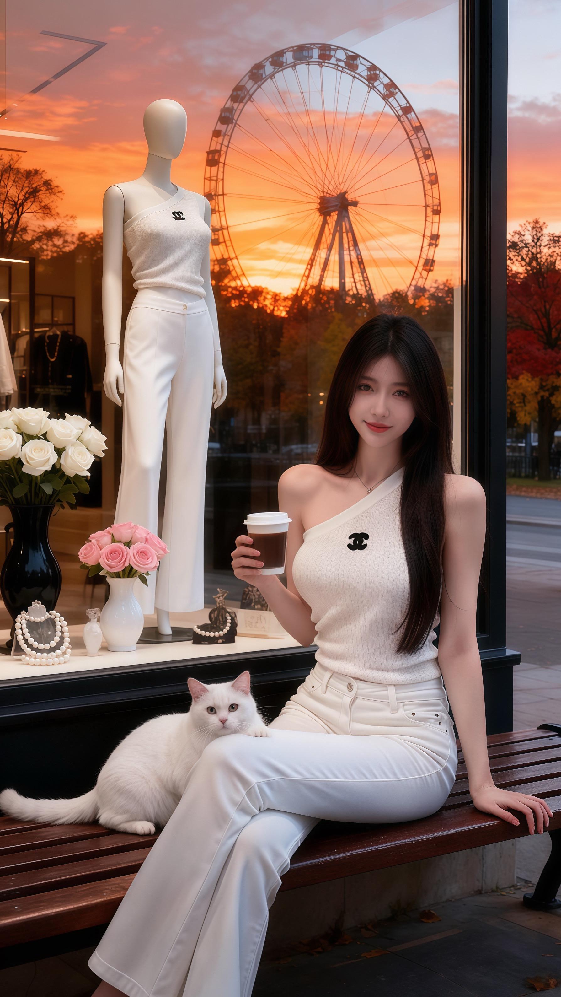 《黄昏摩天轮下的纯白浪漫:她在橱窗前邂逅精致自我》