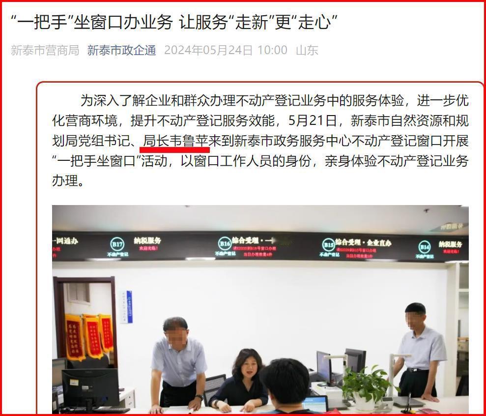在网上刷到山东新泰市二级主任科员韦鲁苹的消息,感觉这名字很熟悉。上网一搜,原来我以前去新泰市政务服务中心办事,她还亲自接待过我。 她曾经在新泰市国土空间规划服务中心、林业局、自然资源和规划局都担任过要职,去年5月份她来到政务服务中心的不动产登记窗口,亲自参加“一把手坐窗口”活动,以一个普通工作人员的身份,为前来办事的市民提供咨询服务。 当时我正好来办理业务,她坐在工位上接待了我。她烫着卷发,衣着时尚,身上的香水味很好闻。窗口的工作人员都是要穿工装的,只有她单独穿着时髦的服装,我也没多想,只觉得她长得很漂亮。 因为我对业务流程不熟悉,问了她很多问题,我还担心她会不耐烦,态度会不好。没想到她人美心善,服务热情周到,耐心解答我的问题,始终保持亲切的笑容,让我感觉很舒服自在。 后来我听到站在她身旁的工作人员叫她“韦局”,才知道原来她并不是普通的工作人员,是来这里体验窗口服务效果的,倾听群众呼声,深入了解群众的办事需求,查找窗口办理业务流程中存在的问题。 这次偶遇让我记住了她的名字,她虽然50岁了,但风韵犹存气质好,对待普通市民没有一点架子。